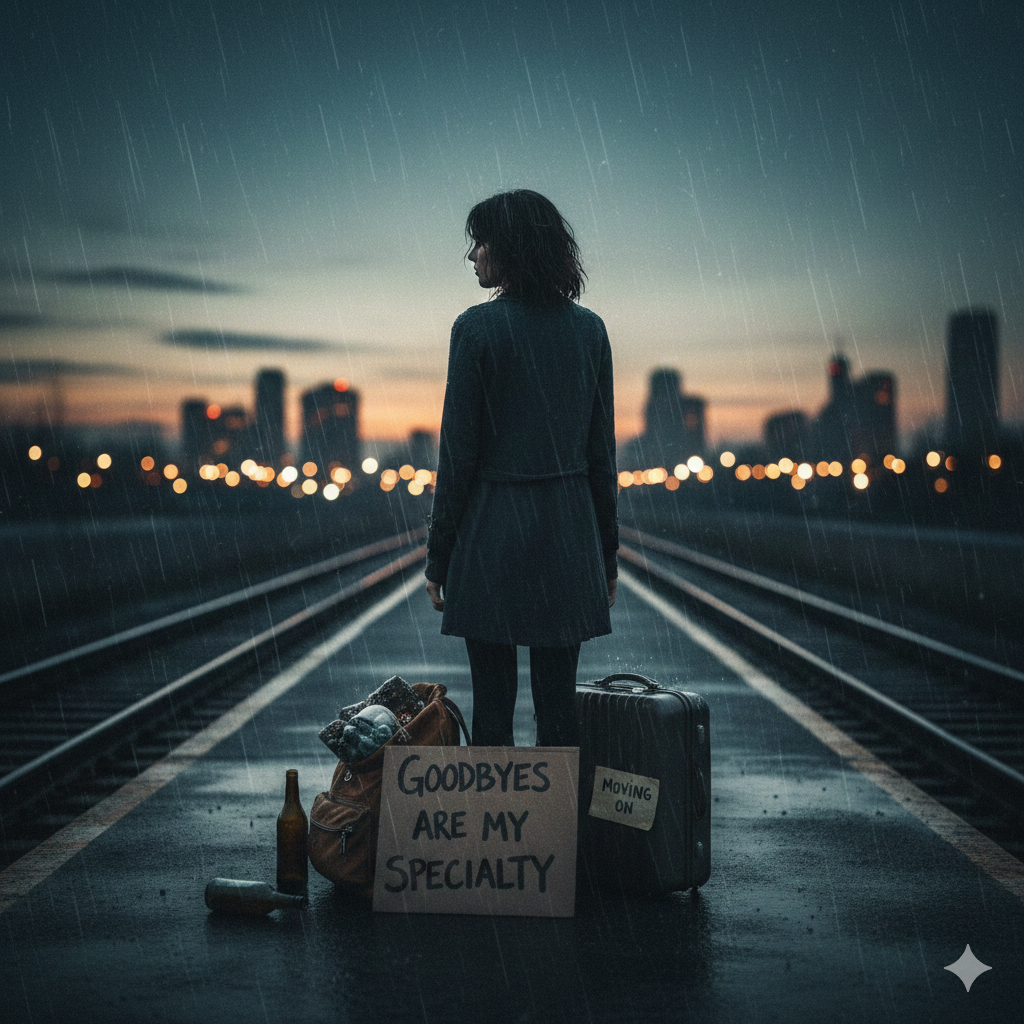 The song opens with slow, minimal acoustic guitar and a deep baritone humming with deadpan, awkward pauses, Alternative folk rock textures remain sparse, letting irony shine through dry delivery, The arrangement transitions to a hip-hop section—driven by 100 BPM trap drums, prominent synth bass, crisp drum machine, and lush, atmospheric synth pads, Confident female vocals deliver assertive spoken-word rap in the verses, clearly riding the rhythmic pocket, Each chorus brings both styles together, blending folk guitar with modern hip-hop sonics, The mix spotlights vocal presence and low-end punch, with vocals humorously self-aware and meta, and awkward transitions enhancing the quirky, dry mood