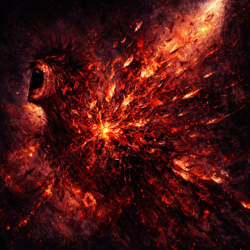 Experimental Nu-metalcore, 200 BPM, [VOCAL: tone: multi-layered, schizoid, male, Japanese, register: guttural low growls to piercing head-voice shrieks, emotion: manic, agonizing, visceral pain, switching between eerie whispering and explosive distortion screams, high-pitched melodic crying in chorus], [CHORUS: Emotional 4536 chord progression, soaring desperate melody], [Guitar: Low-tuned heavy chugging, chaotic feedback], Brutal blast beats, [Note: Pronounce 'ハガレ' as 'ha-ga-re'], ‑Happy, ‑Bright, ‑Pop, ‑J-pop, ‑Harmony, ‑Professional clean, ‑90s Rock, ‑Optimistic, ‑Soft, ‑Commonplace life