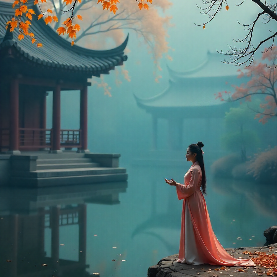 Delicate dizi and xiao melodies open over a gentle pipa backdrop, joined by soft grand piano motifs and lush warm strings, Orchestral textures subtly layer in, creating a cinematic blend, The arrangement gradually builds—melodies intertwine, dynamics swell, and emotion deepens, conveying poetic beauty