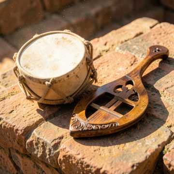 Raw frame drums, rattles, and bone clappers pulse in shifting, uneven patterns evoking ancient procession, A guttural drone from a primitive cow horn anchors lyres and wooden flutes, both exchanging plaintive pentatonic phrases, Bullroarer swells and resonant hammered bronze gongs, conjure the sonic energy of a Bronze Age ritual gathering