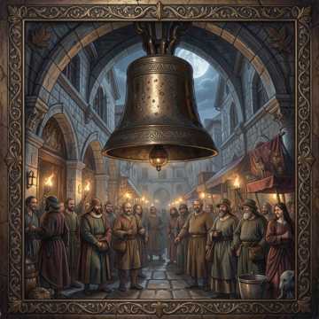 medieval folk, 142 BPM, hurdy-gurdy drones, frame drum ensemble, rebec ornaments, lute strumming, shawm fanfares, hammered dulcimer runs, bronze bell accents, ensemble polyphony, hall reverb, soulful, courtly bustle, syncopated 6/8, abrupt meter shifts, rustic percussion, renaissance market, archaic modal scale