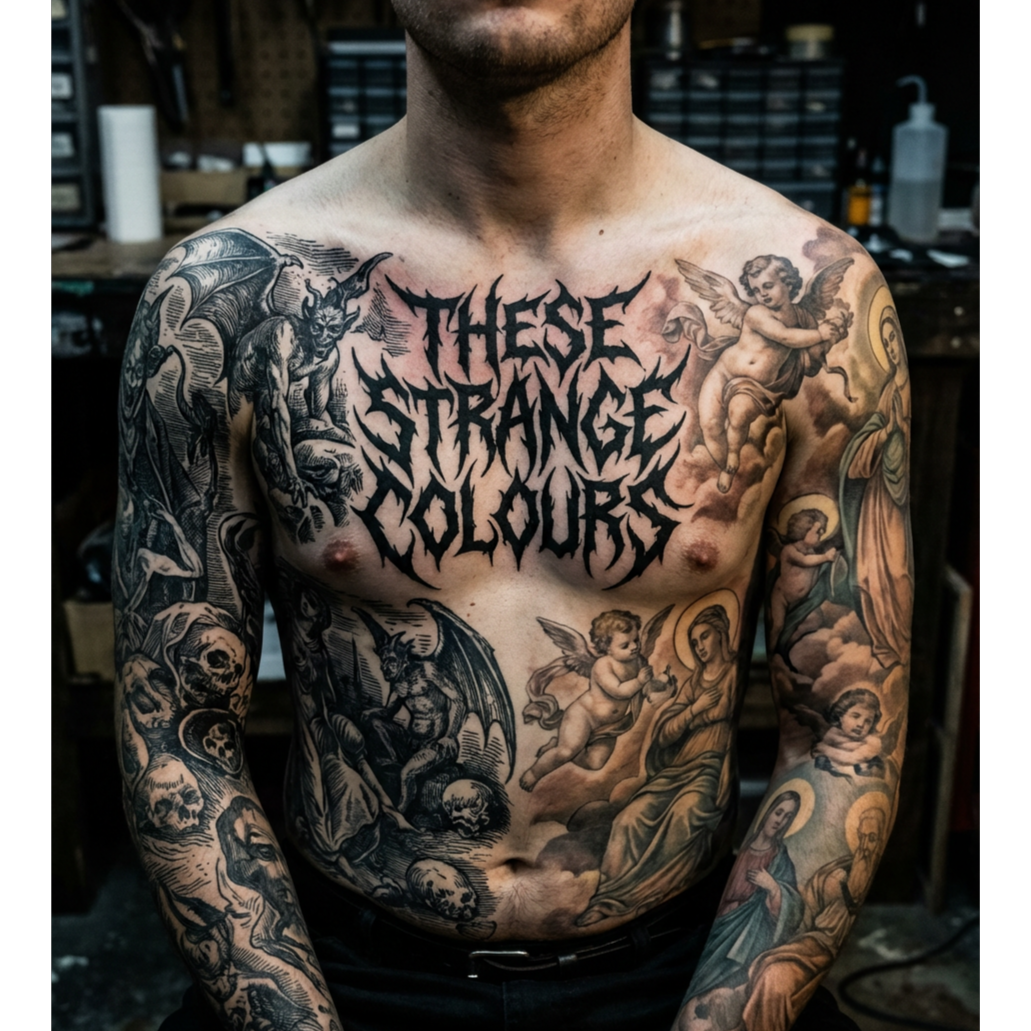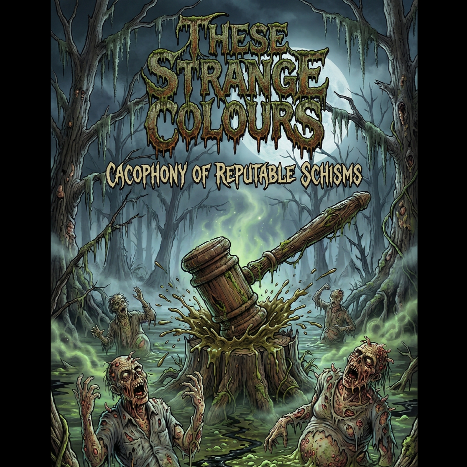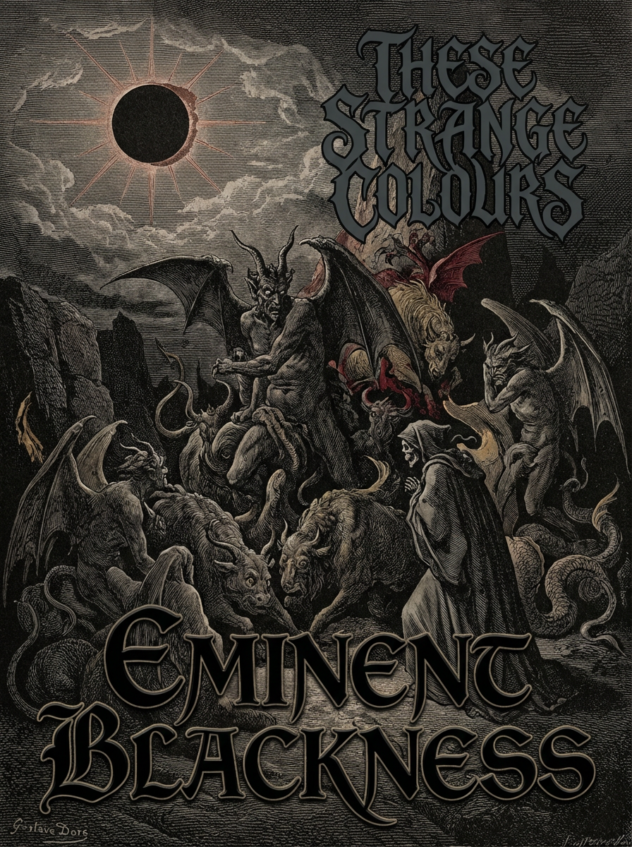 Explosive blackened thrash grind metal erupts with layered, intricate riffs and relentless blastbeats, The rhythm section surges with double bass and sudden tempo shifts, fueling brutal energy, Vocals alternate between guttural growls, screeches, and pig squeals, Extended, chaotic solos amplify tension before plunging back into frenetic riffs, sustaining intensity throughout