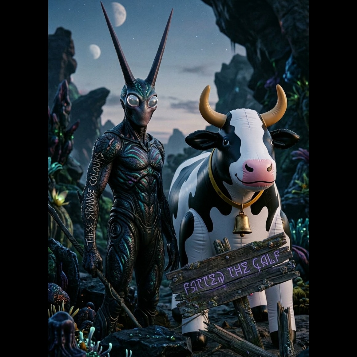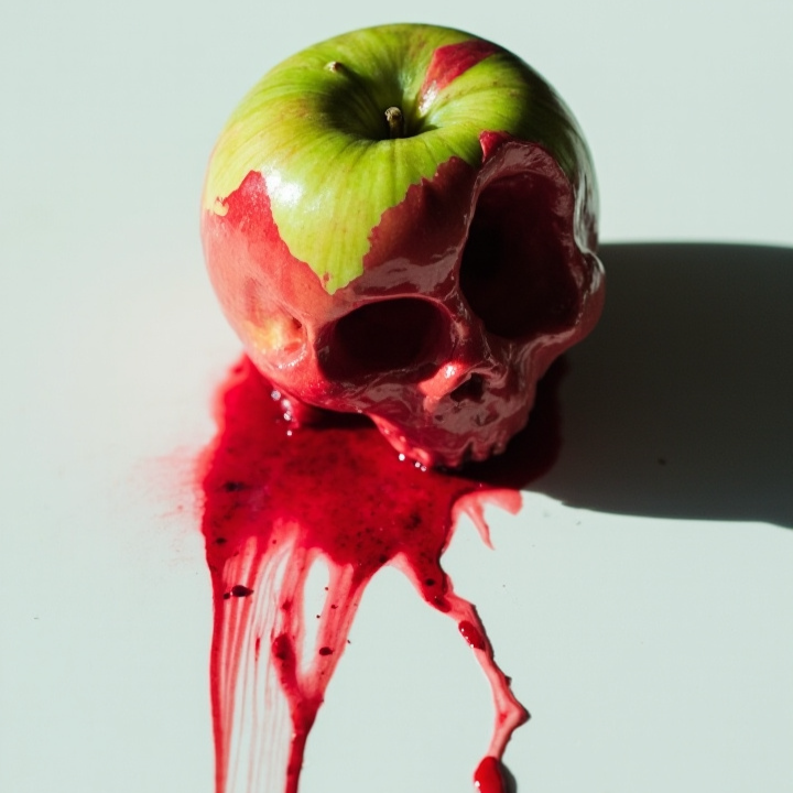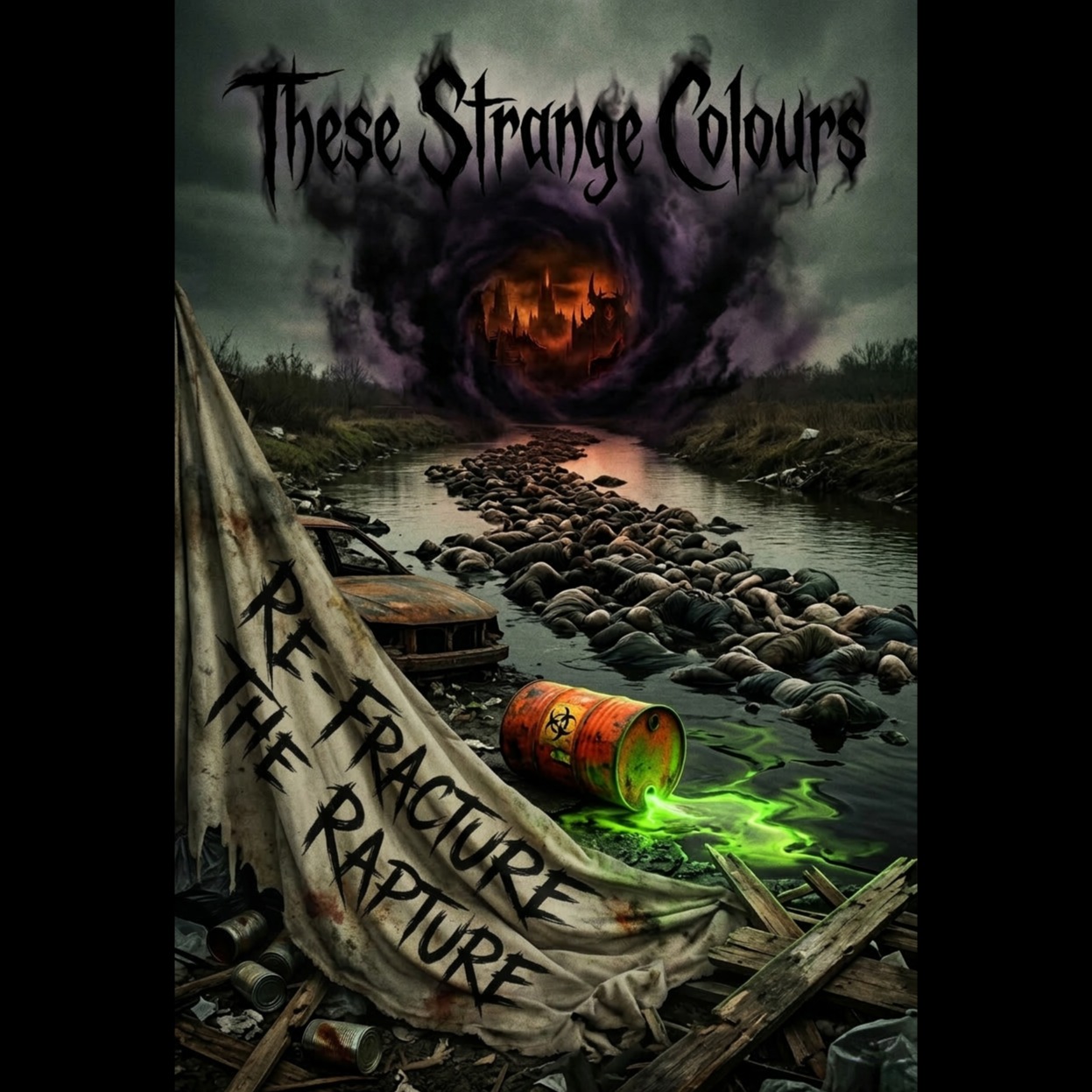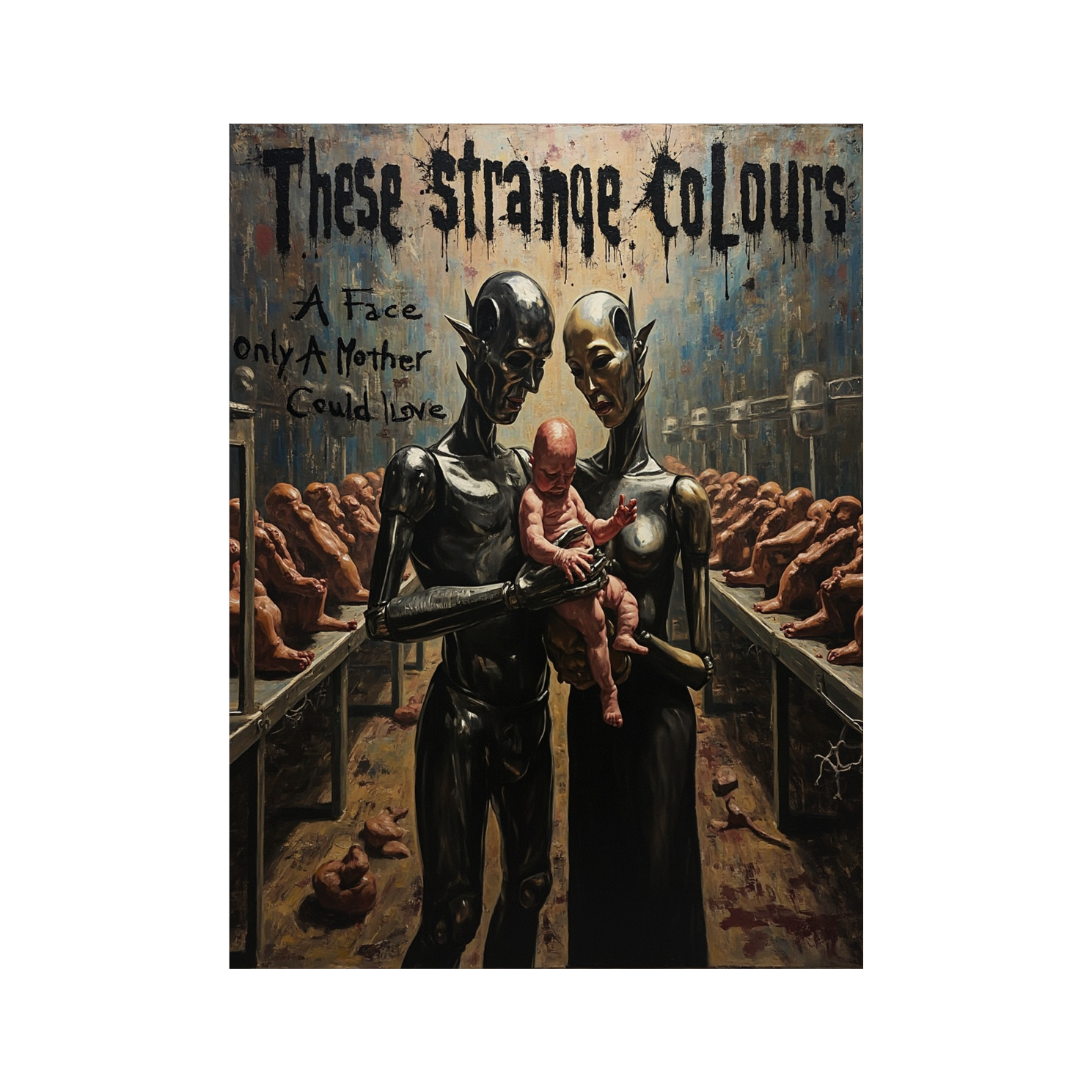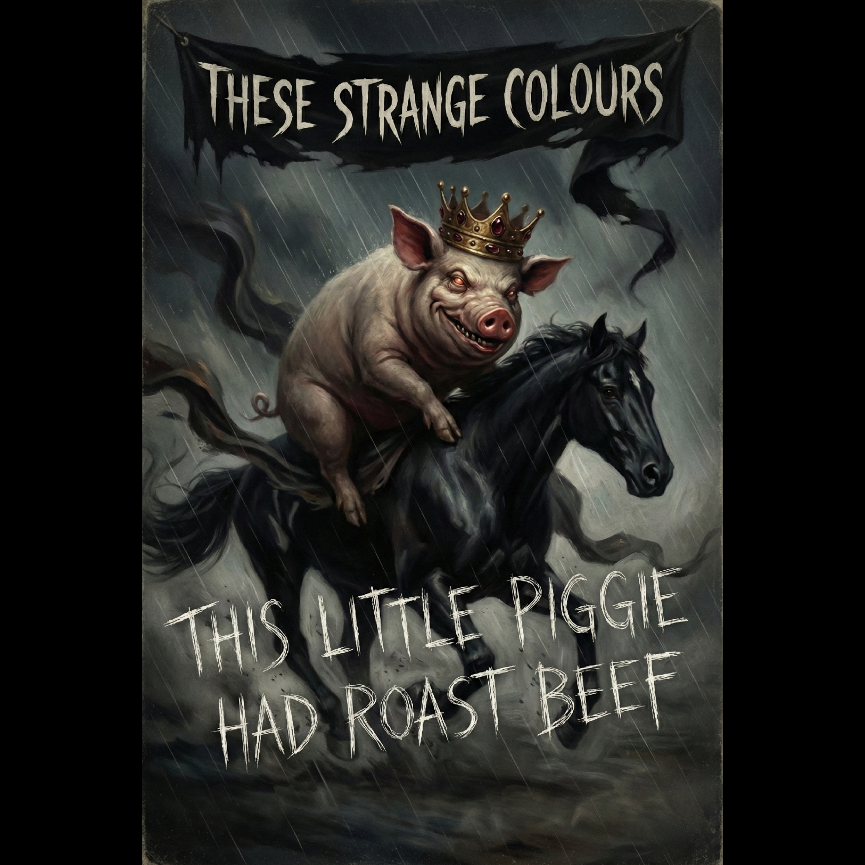 A blistering grindcore onslaught erupts with relentless industrial-tinged drum blasts and hyperactive double kick, anchored by filthy, chaotic thrash riffs and crushing chugged low bass, Guttural death vocals morph into guttural pig squeals over jarring tempo shifts, Raw, live mix with unexpected, swirling string textures adding major-scale melodic lift in dynamic, climactic builds