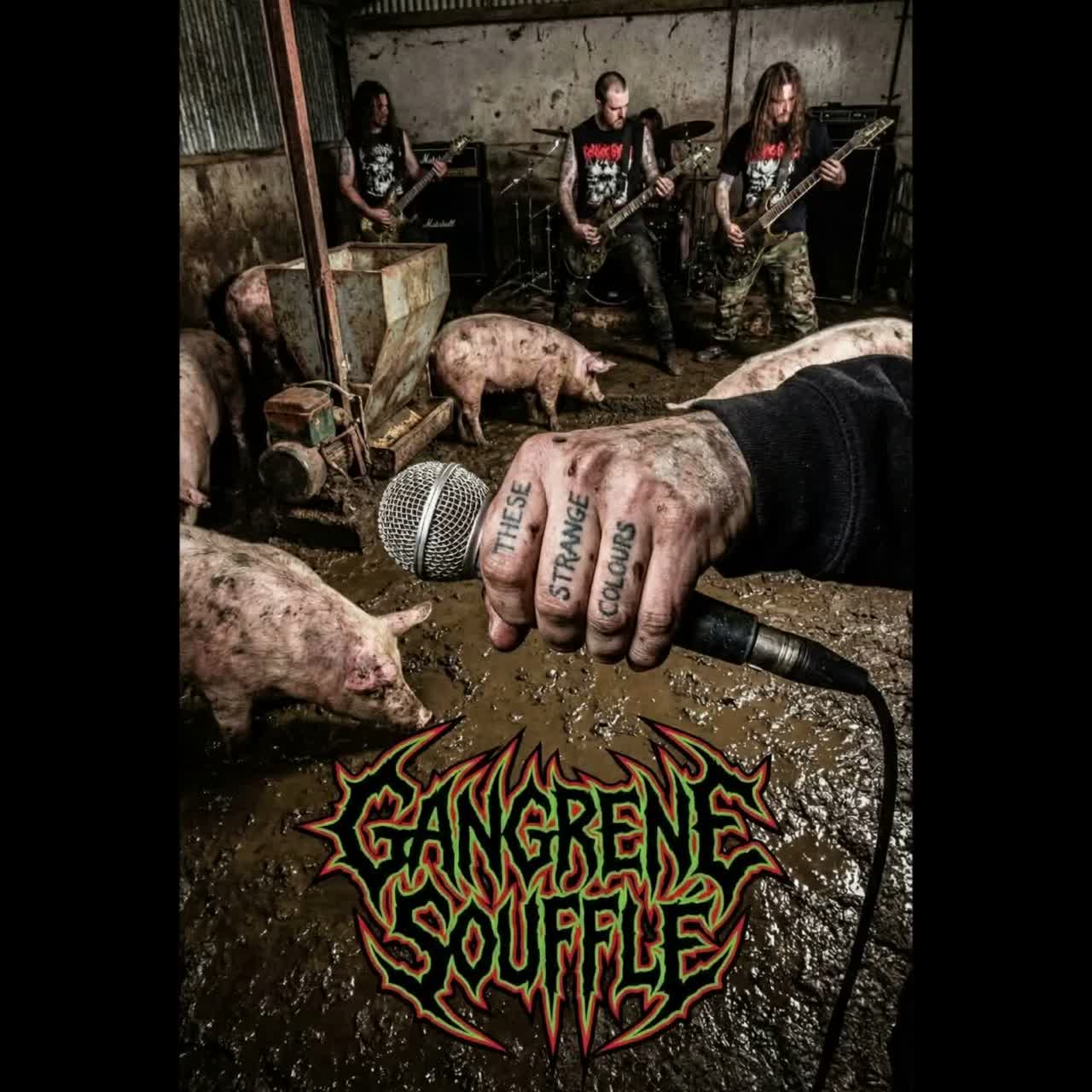 Insane crazy extreme porngrind grindcore gorecore deathcore, Extreme pig squeals, Extreme grind vocal, Sudden unsettling creepy cinematic Instrumental weaves through genres before turning back to the brutal main beat, Live performance, Raw live, porngrind groove gorecore, avant-garde bdm slam hard Rock, progressive grind melodic death metal, dynamic drums range from thundering groove into incredible blast beats in an incredible performance, Incredible complex guitar riffs are exchanged by two lead guitars, each playing thier own individual riffs that inter play with each other, An incredible groove metal bass provides a broad filling sound in deep distortions, The vocalist has a dynamic gore voice, sometimes grinding and squeeling and sometimes brutal deep crunchy gritty screams and sometimes a nasty snorting pig squeel and chunky vomit gurgles, Guitar solos during Instrumentals have long progressive soaring starts with ferocious visceral technical death metal melodic groove porngrind