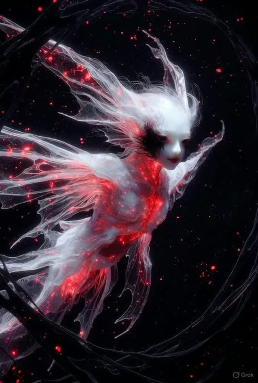 Spoken Word, whisper voice, Deep ocean ambience, Strong dissonance, detuned pads, unstable harmonics, trembling sub-bass, irregular pulses, In the silent deep sea, a woman shaped like a Clione drifts, Her translucent body shivers with pale light, The top of her head splits open—two petals peeling back, releasing four trembling tendrils, Every movement bends the water, twisting the sound into dissonant waves, Tones collide, frequencies scrape, nothing resolves, She leaves a warped shimmer behind her as she whispers: