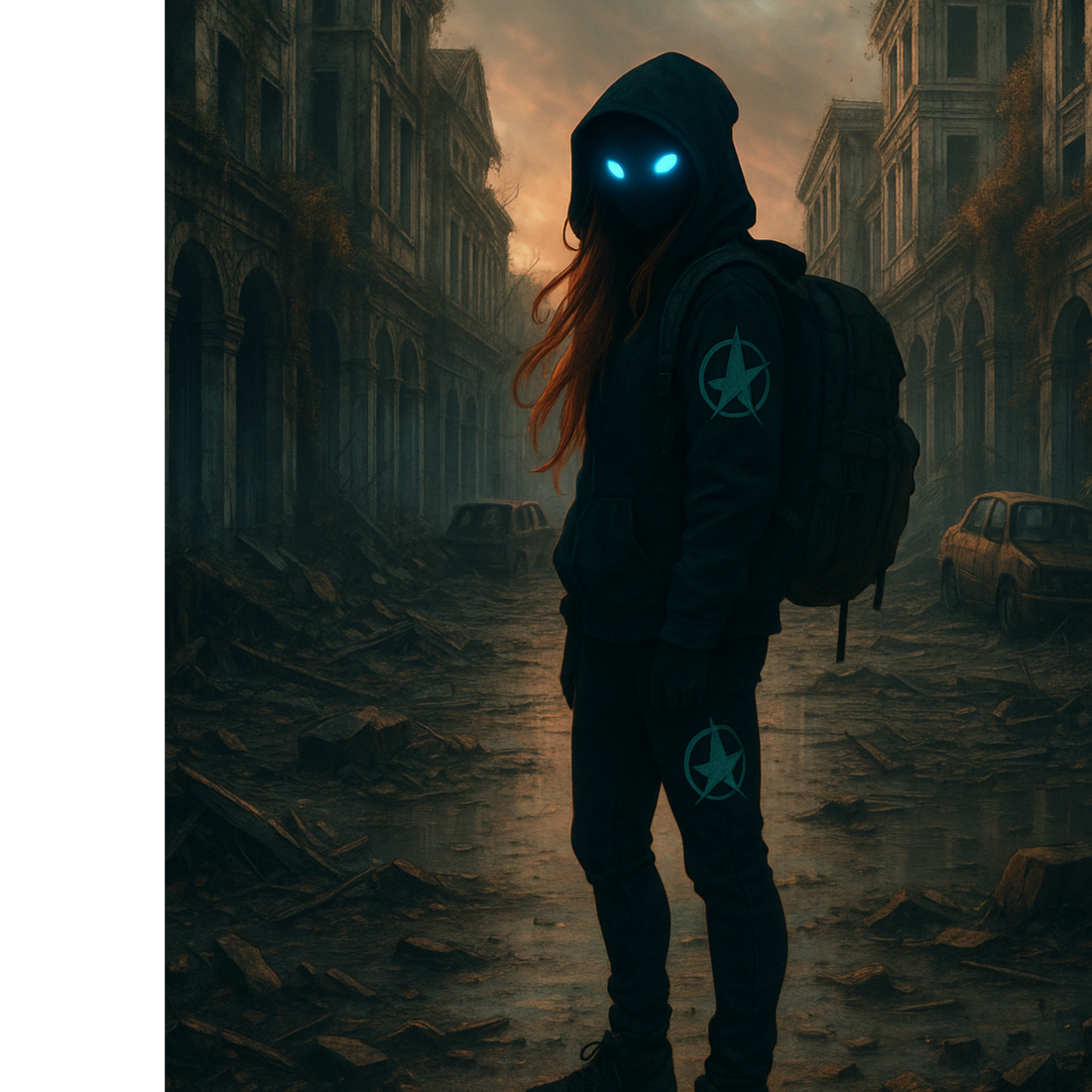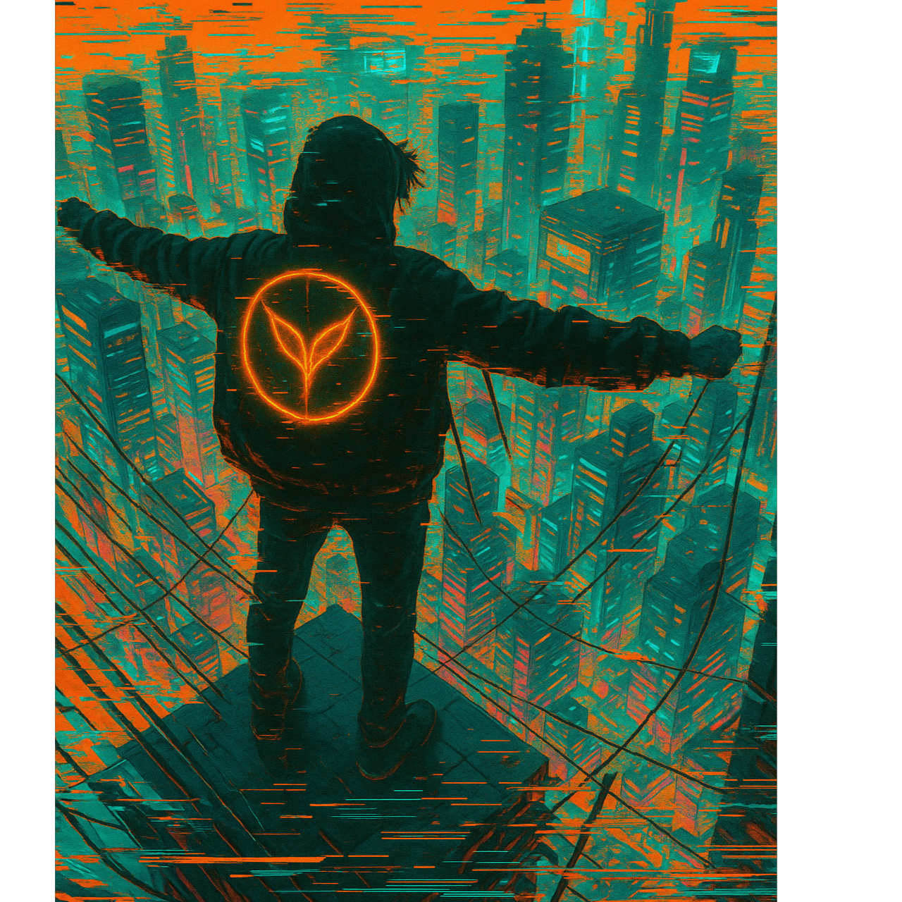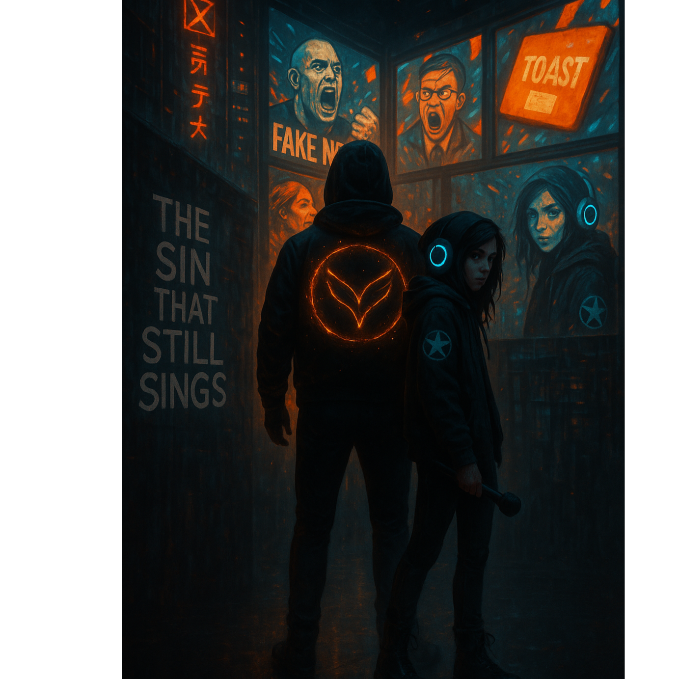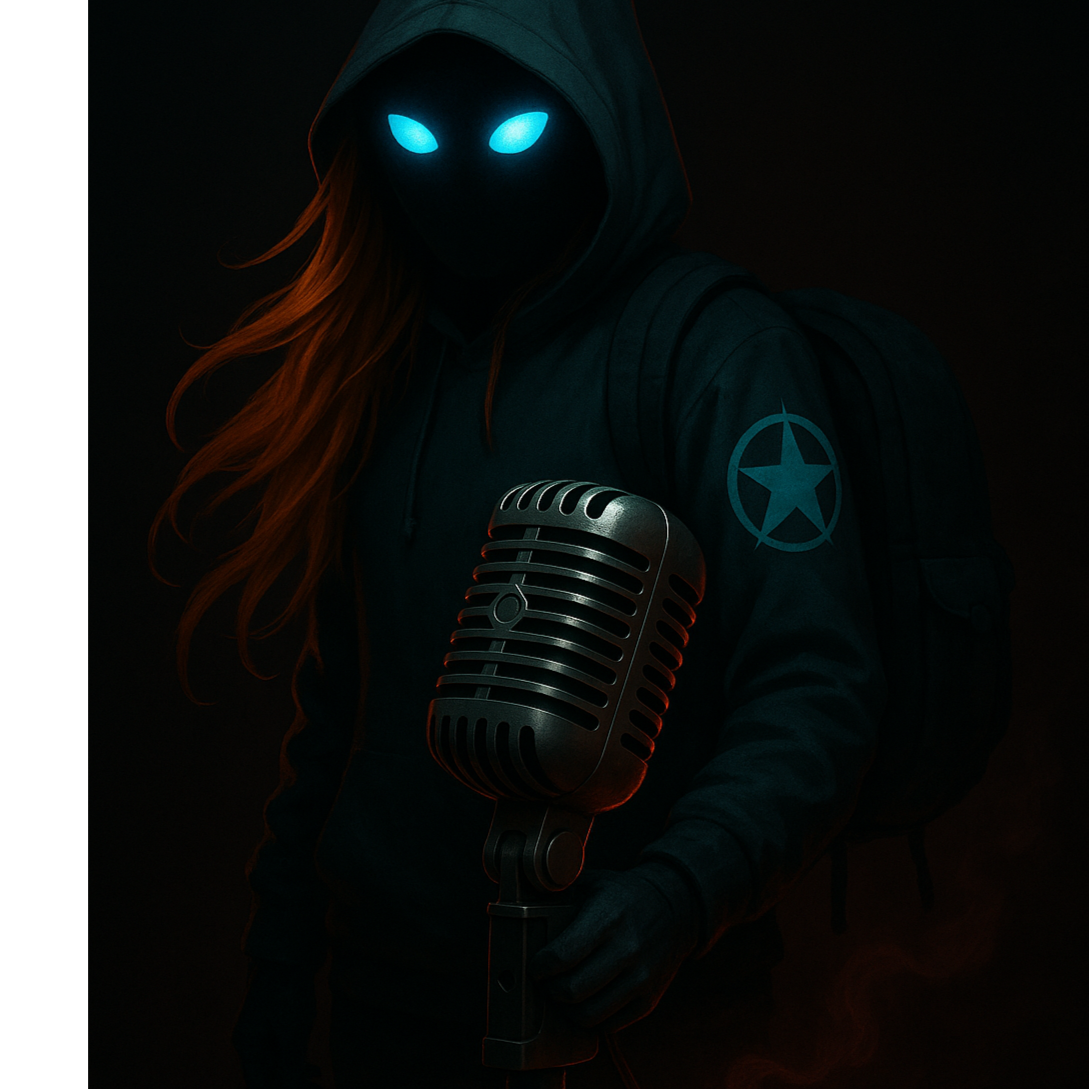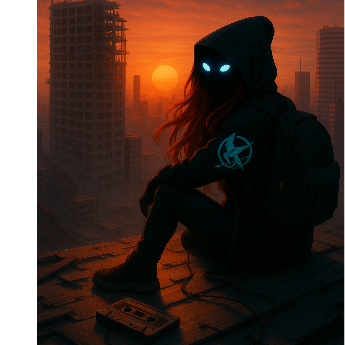 Dark skies, City burning in the distance, Hooded figure on a rooftop, eyes glowing, Lightning strikes across the skyline, Wind pulls at a long coat and loose hair, Heavy air, Tension rising, Whispers that burn, Raps that hit like punches, Hooks shouted with full force, Every line carries weight, No peace, No safety, This is survival music — bitter, bold, unbroken, Verses spit truth with venom, Breaks bring silence before the next explosion, Built for protest, Made for the ones still climbing