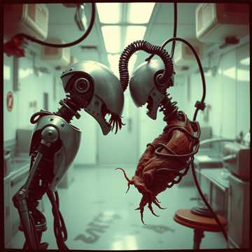 Industrial Dark Synthwave, Aggressive EBM, Power Noise, Cyberpunk Body Horror, Mood: Intense pain, brutal/forced body mod, clinical chaos & visceral struggle, Flesh/metal merging, Violation, change, twisted power, Sonically unsettling/intense, not graphic gore, Music & Production: Heavy, distorted, pounding, irregular/glitchy rhythms (scalpel, spasms), Strident, dissonant synth leads (pain, machinery), Deep industrial bass, metallic clangs/screeches, Sections of chaos & cold rhythmic precision, Non-melodic; aggressive textures, Harsh, abrasive, powerful, impactful, Raw, visceral, claustrophobic, Tempo: Mid-fast (120-150 BPM), heavy, relentless, mechanical, Sudden shifts, Instrumental
