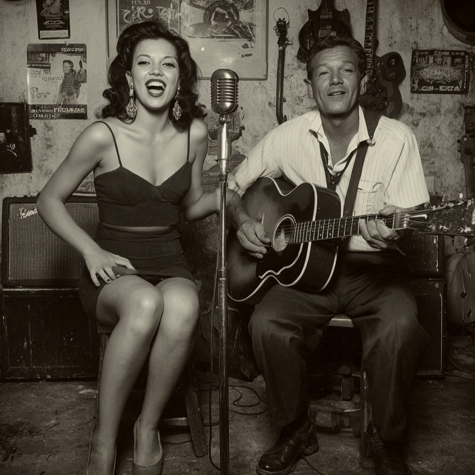 Vintage 50s/60s rockabilly with psychobilly twist, old-school analog sound, slightly raw and gritty, Tempo 100 BPM, swing and slow rhythm, A minor, Instruments: twang electric guitar (fingerpicking + strummed riffs), slapback echo; upright slap bass; vintage drums (kick, dry snare, light hi-hat, simple fills); optional boogie piano, tambourine, claps, Vocals: male voice, very deep, raspy, gritty, psychobilly style like Mark 'Sparky' Philips of Hillbilly Moon explosion; female voice, soft, vintage 50s and psychobilly style; alternating lines, harmonies, playful and romantic, Production: warm analog saturation, short natural reverb, vintage retro mix, slightly rough edges, instruments distinct but blended, Mood: wild, romantic, playful, cinematic, nostalgic, high-energy love story