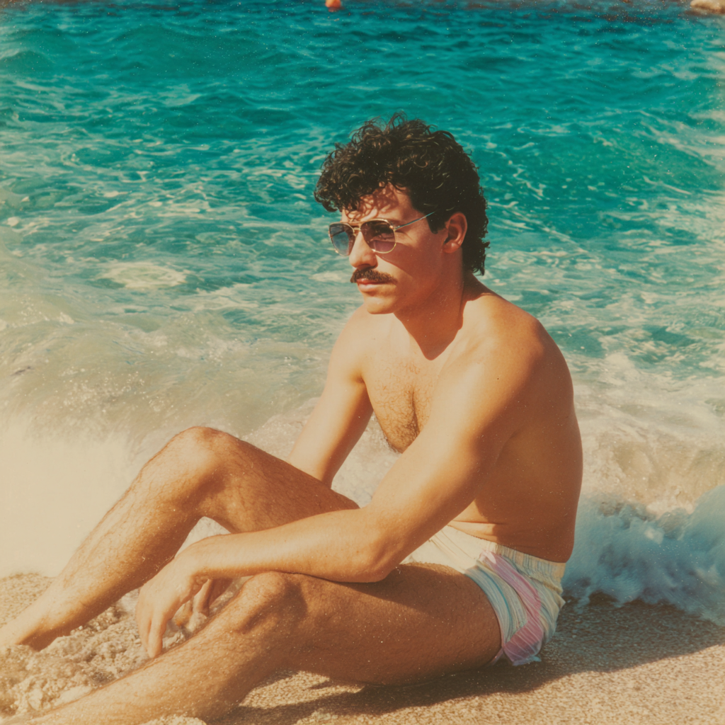 1980's recording, cassette recording sound aesthetic, Summer anthem, 1983, 1980's, italodisco, synth-pop, Italian, analog 1970's remnants, EDM, electronic, dance, eighties, mood: fun + vibrant, 80's new wave male singer