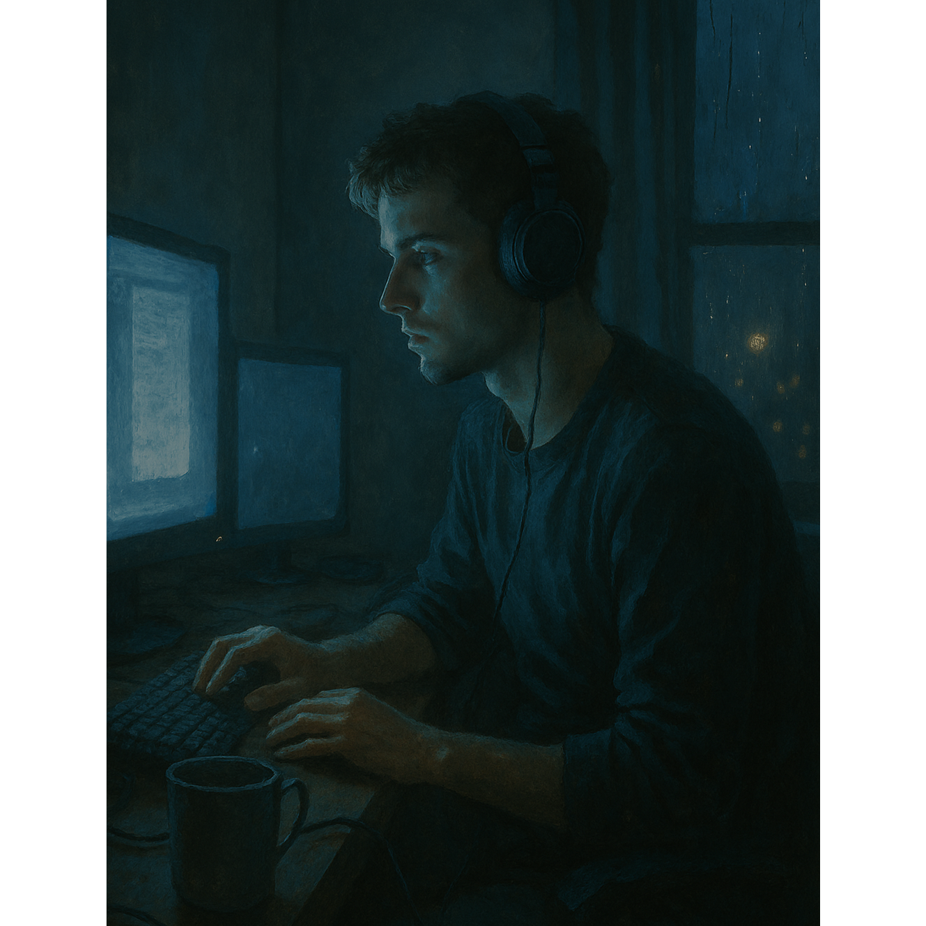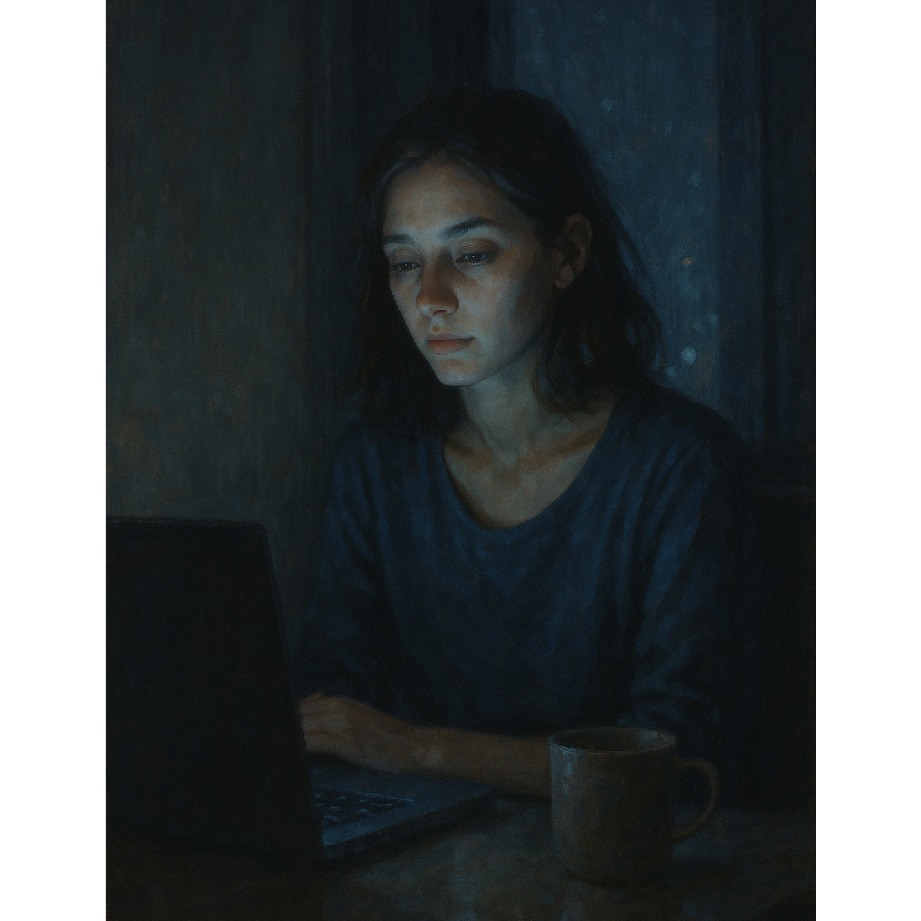 Lo-fi cinematic pop (78 BPM, key F minor), Female vocal intimate, breathy, and tired, as if speaking to herself, Minimal drums, analog pad, faint rain and kettle ambience, soft sub-bass, The mood is still, human, and self-contained, capturing quiet isolation under screenlight, Cohesive with The Building at Number 7 sound world