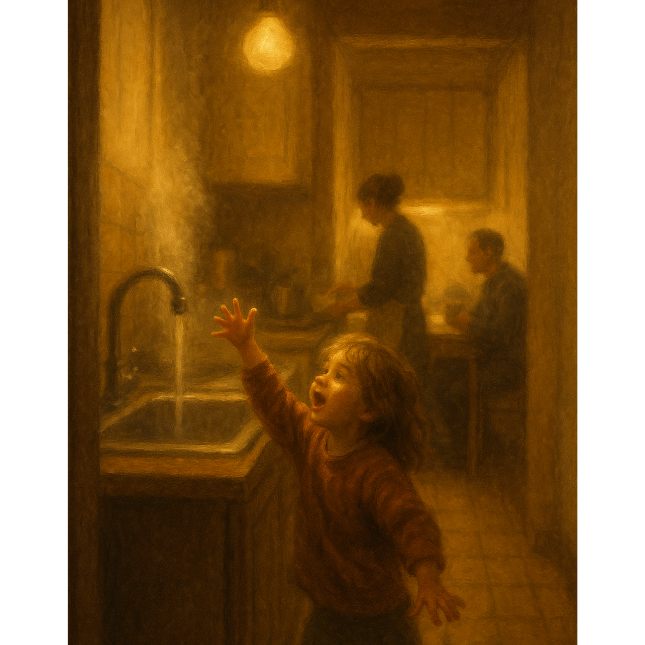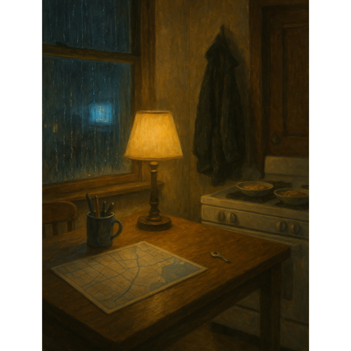 Lo-fi cinematic pop (78 BPM, key F major), Male vocal, tired and intimate, close-mic and warm, Electric piano, brushed drums, soft sub-bass heartbeat, rain ambience through a thin apartment window, gentle radio-in-the-room texture, Small kitchen at night feeling, quiet survival, parent and child routine, Cohesive with The Building at Number 7 sound world