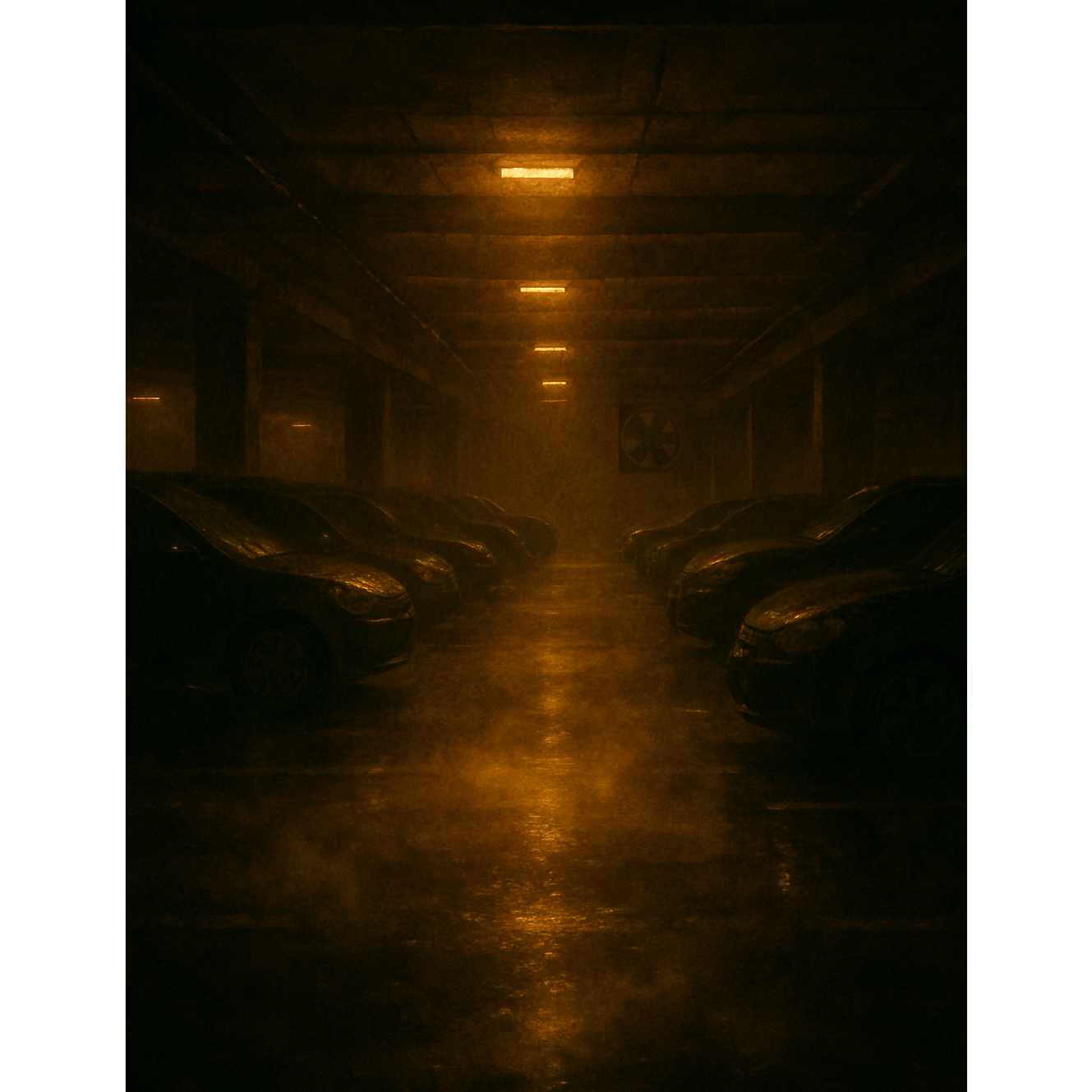 Cinematic ambient hymn (78 BPM, key D minor), Low baritone male vocal — The Building Himself — calm and resonant, blending breath with machinery, Sub-bass drone from car engines, metallic reverb, and slow mechanical pulse, Concrete room acoustics, soft rain reflections, and deep analog warmth, Feels like the structure dreaming of its own body, Cohesive with The Building at Number 7 sound world