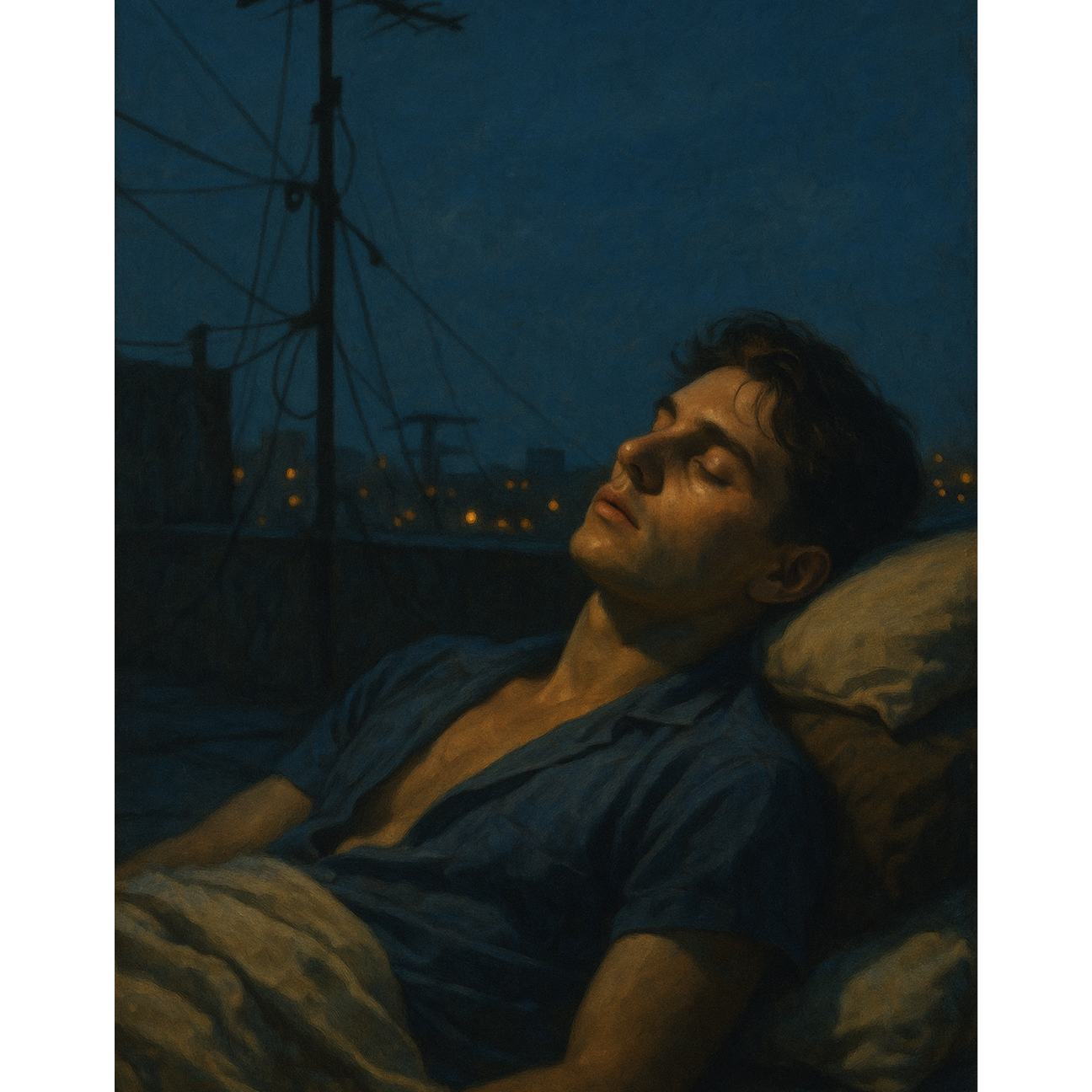 Cinematic lo-fi pop ballad (76 BPM, key G major), Male crooner vocal — warm, sensual, youthful baritone with soft falsetto touches, Electric and acoustic guitar blend, brushed percussion, subtle bass, and analog reverb, Night air ambience, gentle tape hiss, and faint Building hum, Dreamy rooftop intimacy, cohesive with The Building at Number 7 sound world