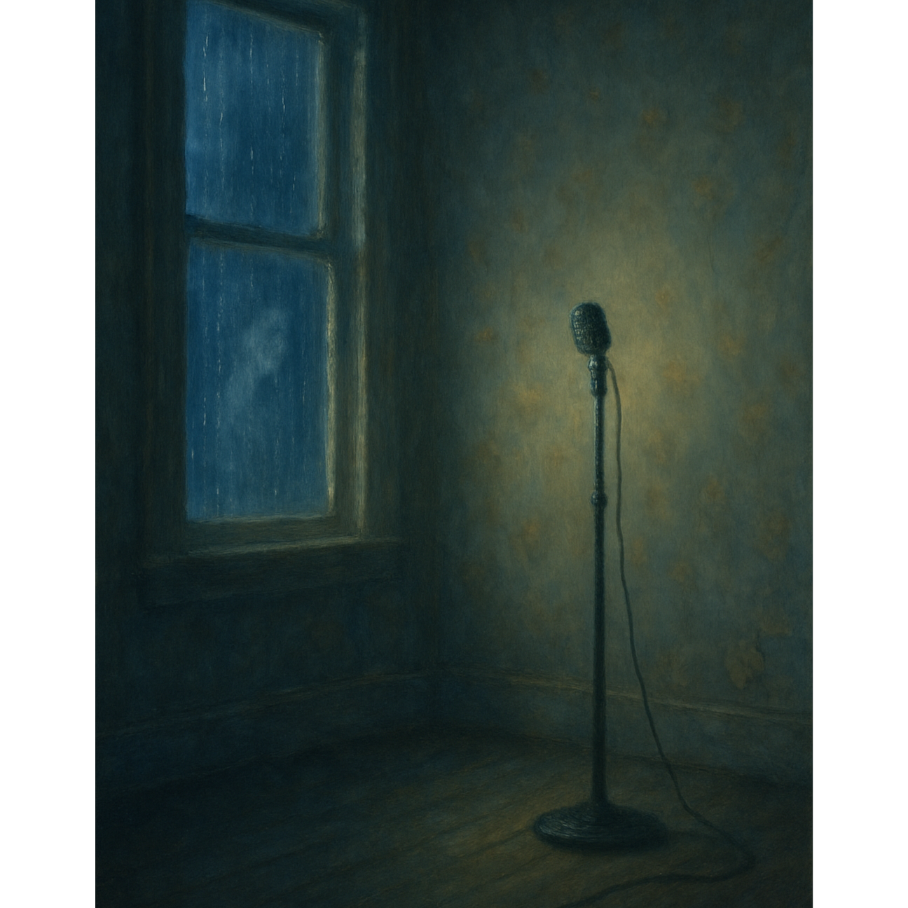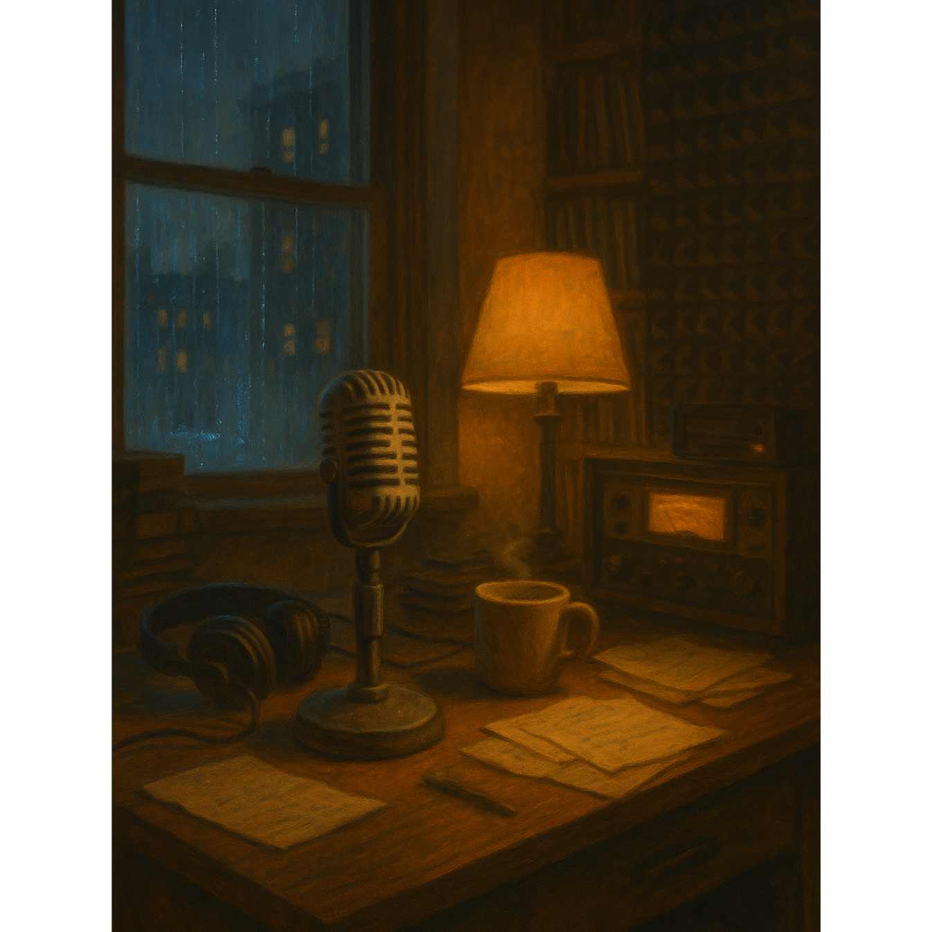 Lo-fi cinematic ballad (74 BPM, key C major), Male vocal in an older baritone voice, warm and human, with the phrasing of a retired radio host speaking to an unseen audience, Delivery is half-sung, half-spoken, full of tired grace and nostalgia, Electric piano, upright bass, brushed drums, analog pad, and soft vinyl crackle with faint radio static, Rain ambience fills the background, creating the sense of an empty broadcast room at night, Emotionally grounded and cohesive with The Building at Number 7 sound world