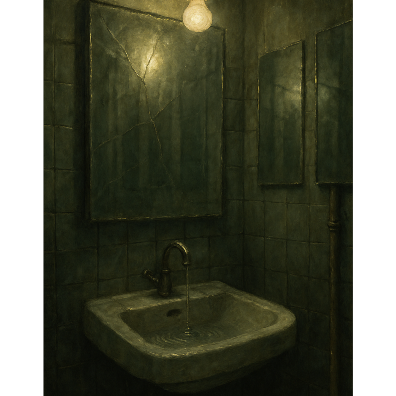 Experimental ambient piece (70 BPM, key D minor), Male baritone vocal fragmented through metallic reverb and mirrored delay, Water drip rhythm, glass resonance, and low analog bass pulses, Voice bends and reflects against itself, creating slow shimmering distortion, Reflective, introspective, and transitional, cohesive with The Building at Number 7 sound world