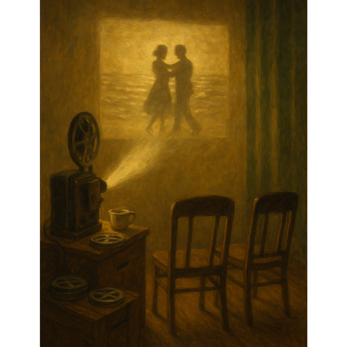 Cinematic ambient folk (72 BPM, key E minor), Male and female duet with warm low voices, quiet and nostalgic, Film reel flutter and tape hiss as rhythmic texture, Slow repeating piano, soft analog pads, and gentle delay guitar shimmer, Dreamlike repetition and fading light, like lovers inside a looped memory, Cohesive with The Building at Number 7 sound world