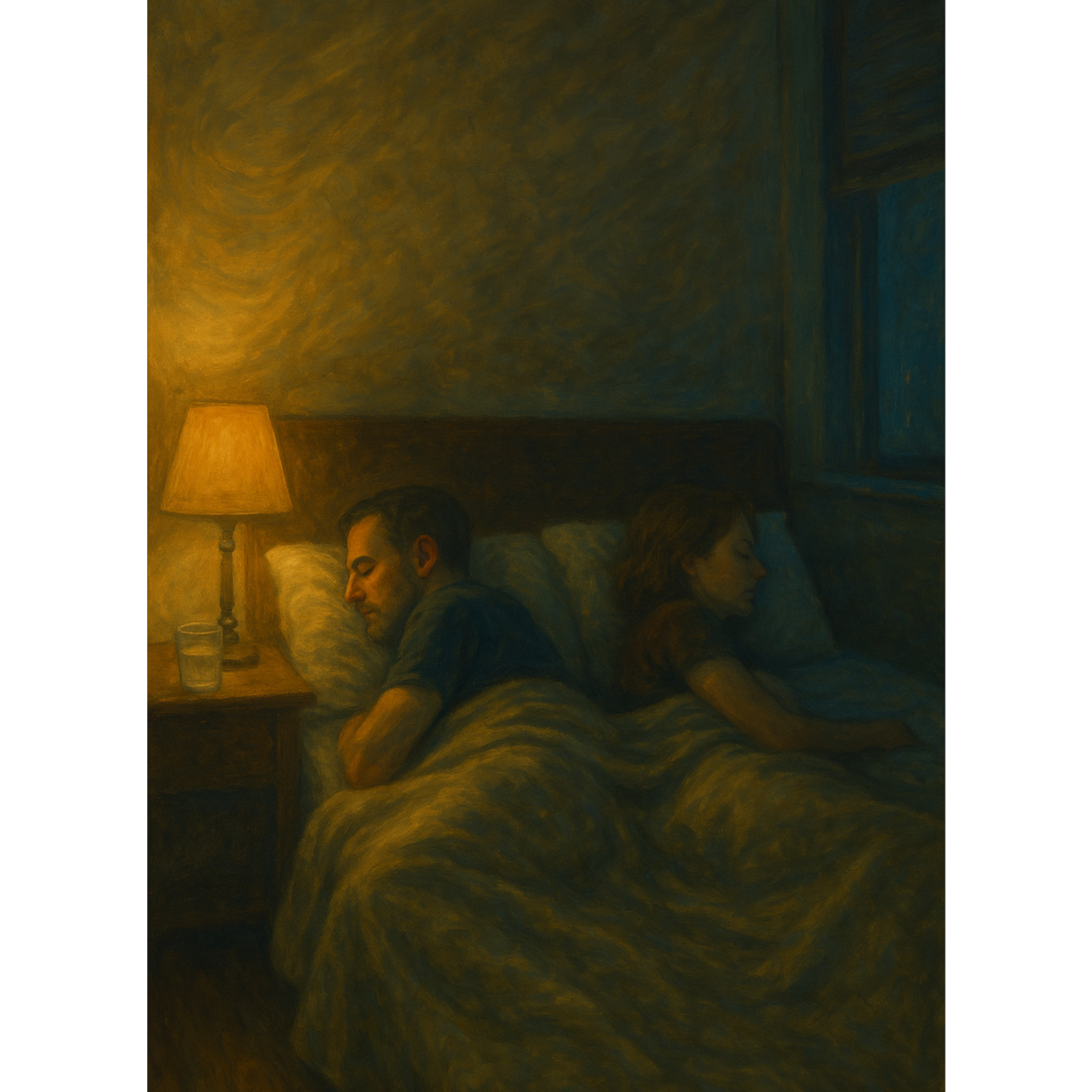 Minimalist lo-fi cinematic duet (80 BPM, key D minor), Male and female vocals in quiet harmony, intimate and restrained, Electric piano with gentle tremolo, brushed snare loop, soft analog pad, and low sub-bass heartbeat create the sense of slow air and repetition, Subtle room hiss and evening ambience mirror a lived-in apartment silence, Cohesive with The Building at Number 7 sound world