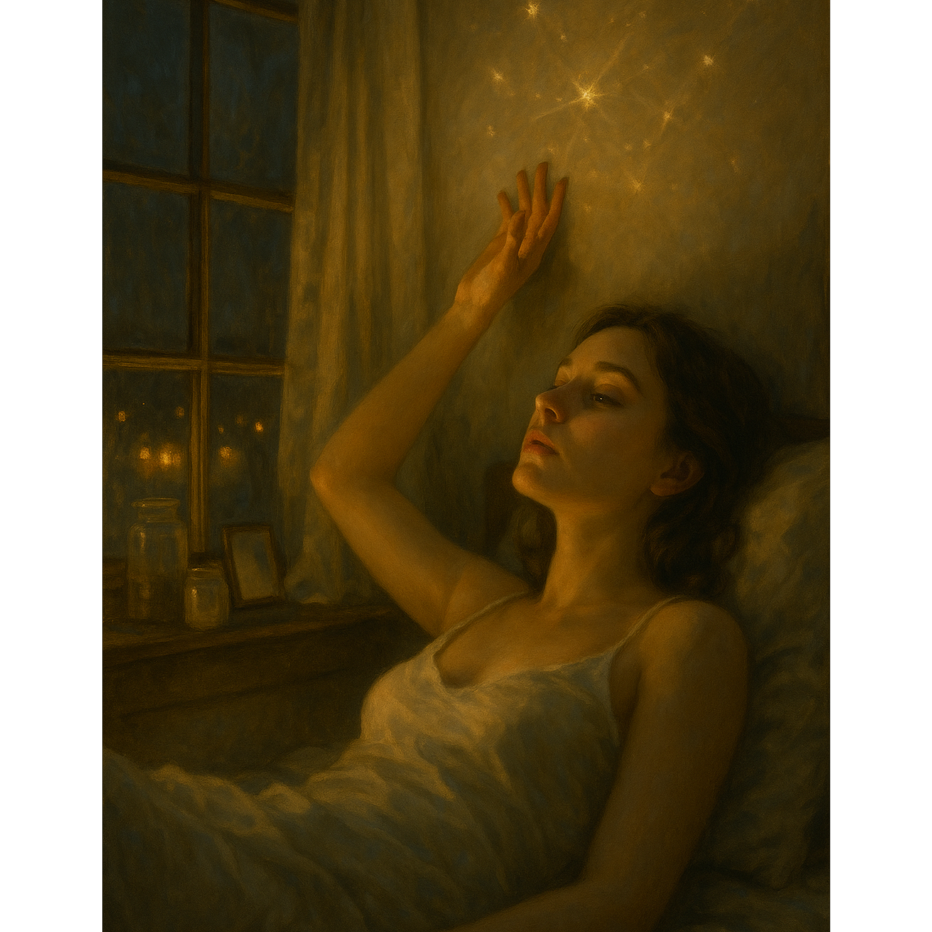 Cinematic dream-pop ballad (78 BPM, key A major), Female vocal — sensual, breathy, luminous tone with gentle reverb and close-mic warmth, Soft piano, airy synth pad, brushed percussion, and subtle bass shimmer, Night wind ambience through window glass, layered reflections of city light, Emotional atmosphere of quiet wonder and forgiveness, cohesive with The Building at Number 7 sound world