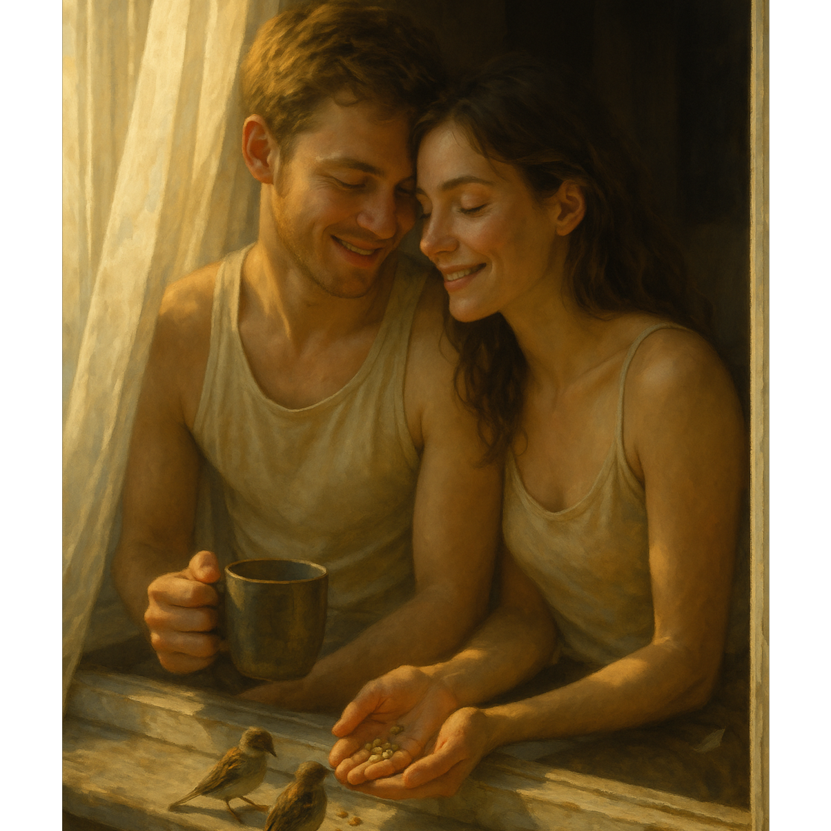 Cinematic lo-fi pop duet (82 BPM, key F major), Male and female sensual vocals, close and breathy, blending in warm harmonies, Acoustic guitar, gentle percussion, soft bass, and window-side ambient textures — birds, coffee cups, curtain rustle, Analog warmth with subtle tape hiss, Atmosphere of morning intimacy and quiet devotion, cohesive with The Building at Number 7 sound world