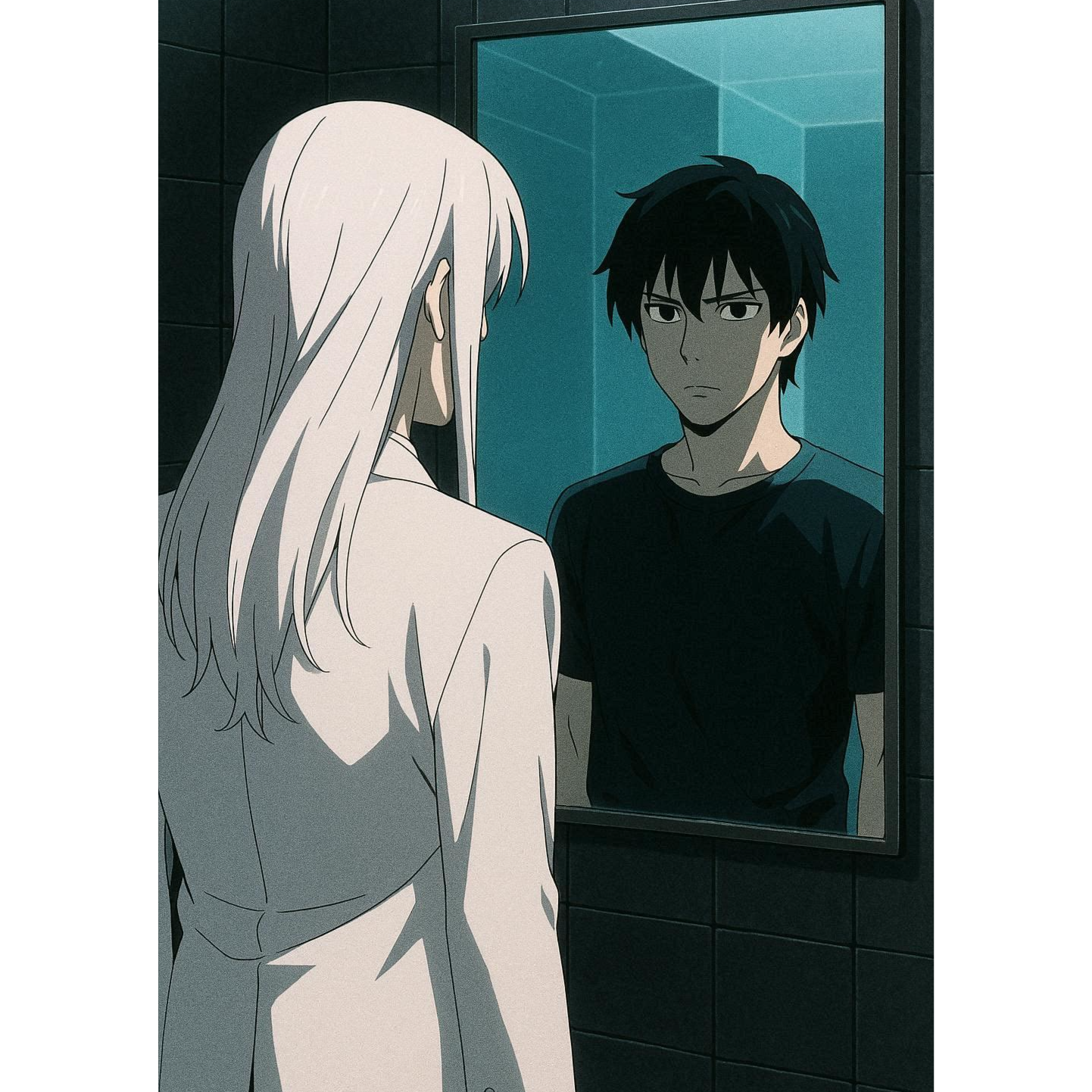 Japanese Horror Mystery Anime Classical Influenced Atmospheric Black Synth JMetal with Heavy Eerie creepy electric piano focus, Horror mystery anime opening theme that mirrors the unsettling feeling the protagonist has throughout, Dual Males Japanese Boyband Lead singers duet with slowish panicked breathy passionate vocals, Quiet false chord backing