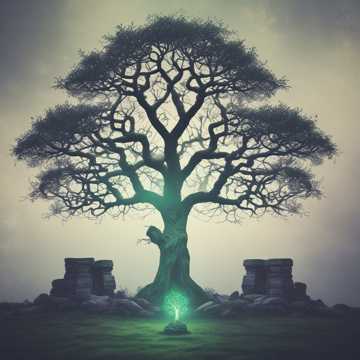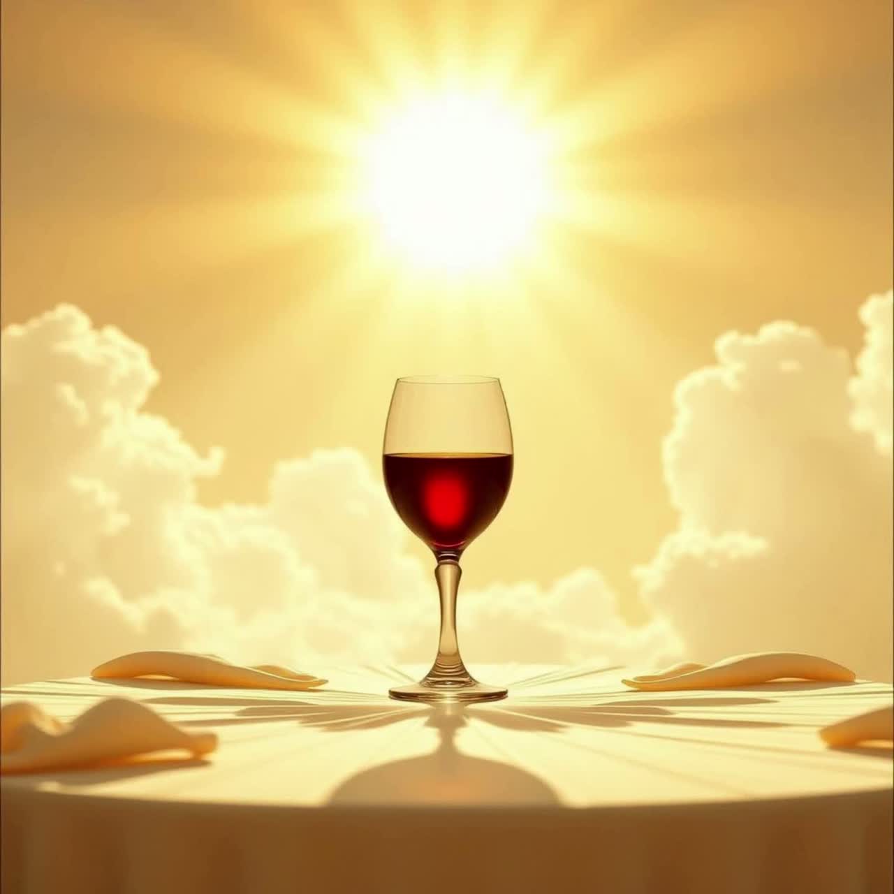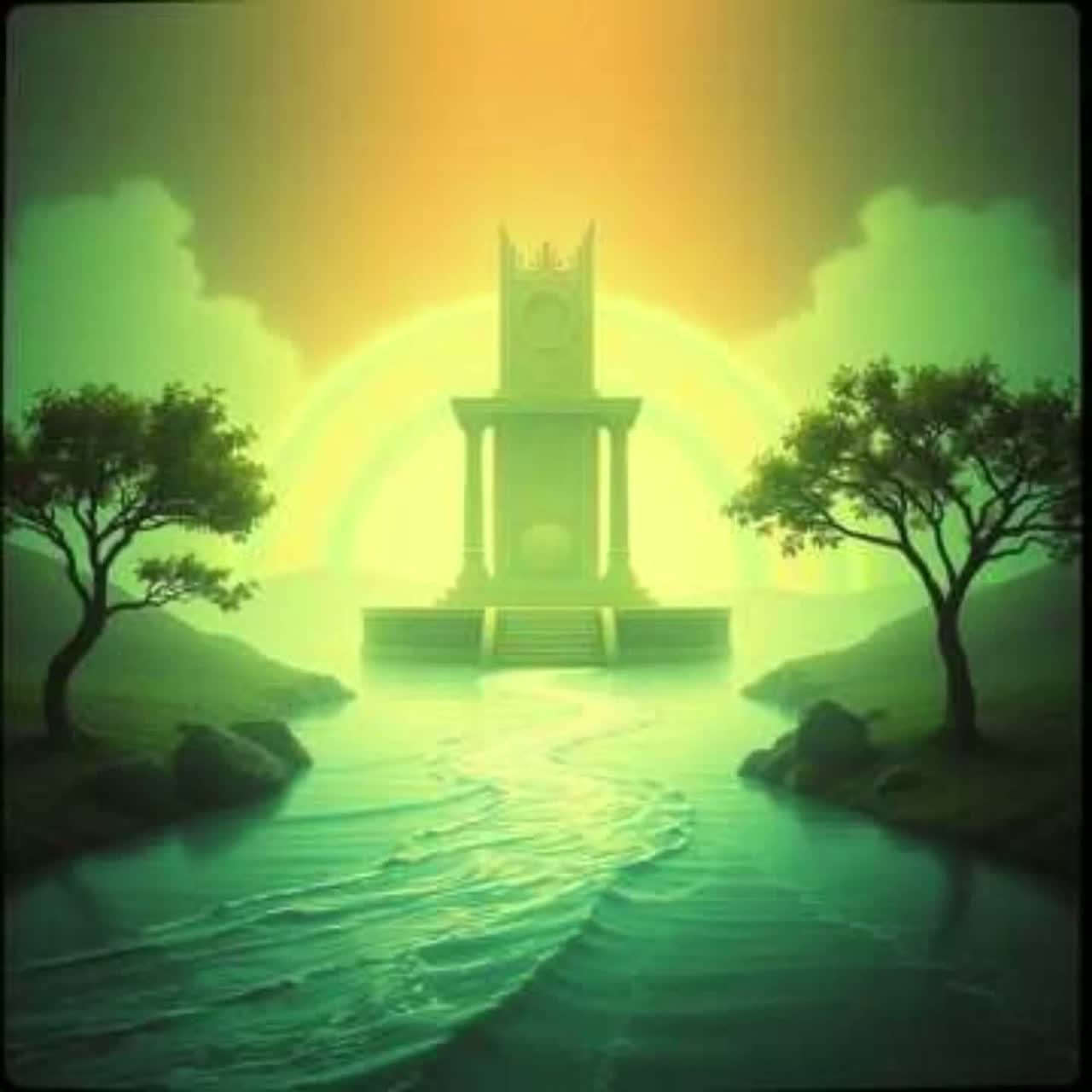 Deep tribal drums set a hypnotic, pulsing groove, layering congas, djembes, and low toms, The main section spotlights a powerful female lead, her clear dynamic vocals front and center, while a chorus of harmonic voices interweaves syncopated, rhythmic chants, building intensity throughout, Album Cover: The throne of God with an Emerald Rainbow encompassing it and a river flowing below it with a fruit tree on both sides