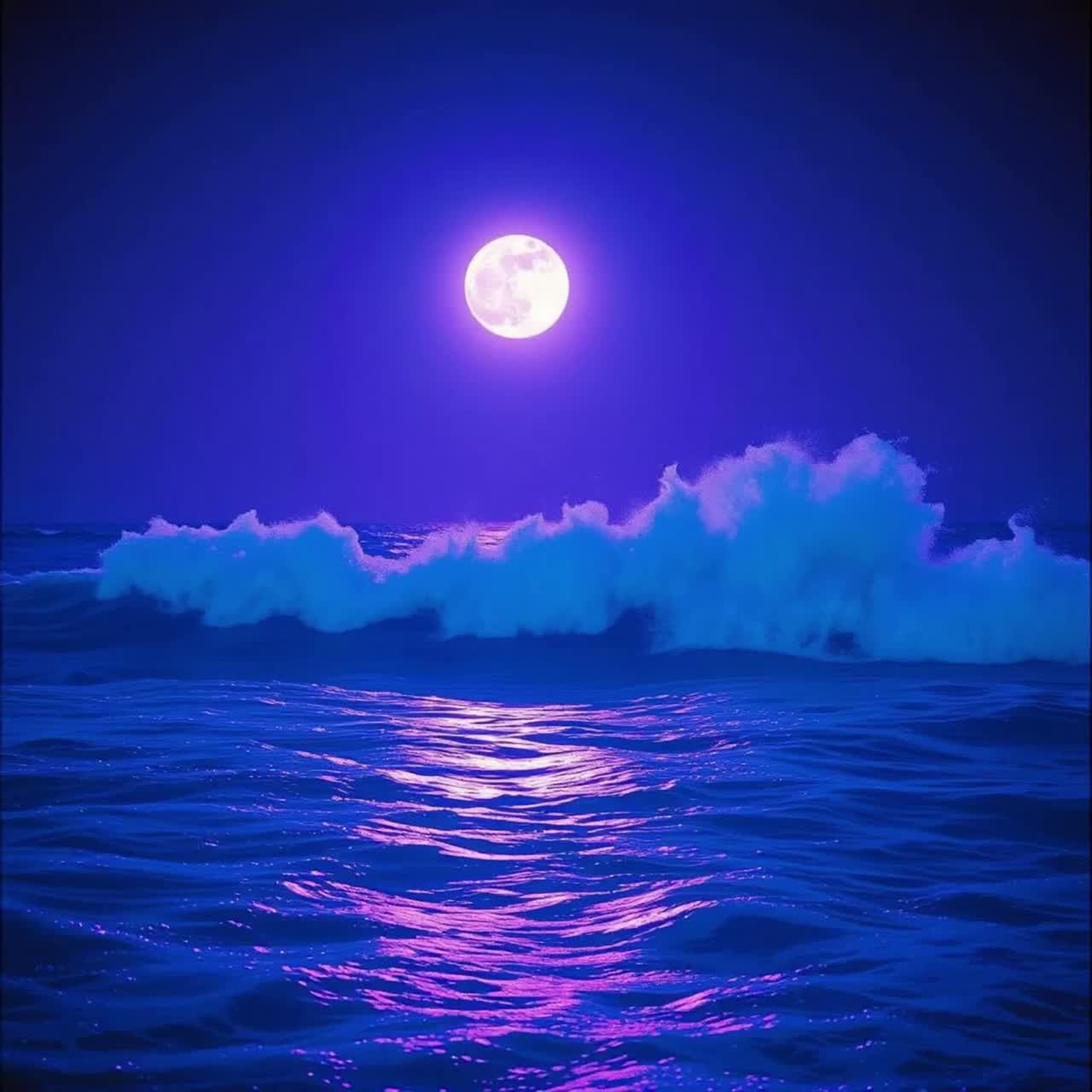 Album cover: using cyan and violet hues, powerful ocean waves after sunset surrounding the silhouette of a female, ‑country, ‑folk, ‑bluegrass, ‑screaming, ‑rhythmic clapping, ‑rhythmic snapping, ‑spoken word, ‑modulted key