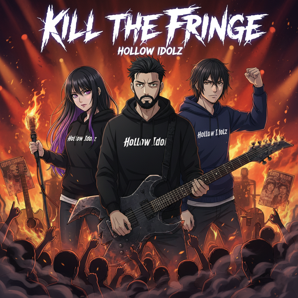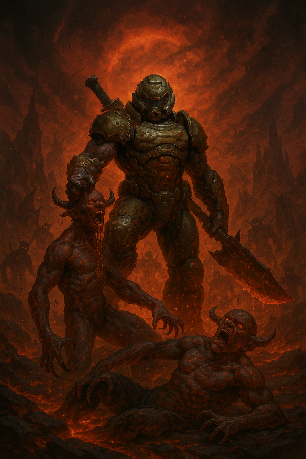 Create an apocalyptic, guitar-dominated industrial metal track forged for a descent into Hell, Feature low-tuned, saturated guitars with brutal chugs, tremolo-picked riffs, and rhythmic breakdowns that hit like falling ash, Layer glitch effects, metallic textures, and cinematic build-ups to create a sense of unstoppable momentum, Use distorted bass and pounding, double-kick drums to shake the underworld, Screamed or growled vocals should sound tortured and distant, echoing in a cursed cathedral, The overall mood is dark, relentless, and epic — perfect for soundtracking an all-out war against demons in the fire-soaked depths of chaos, Style of Music: Metal, Industrial Metal, Hellcore, Cinematic