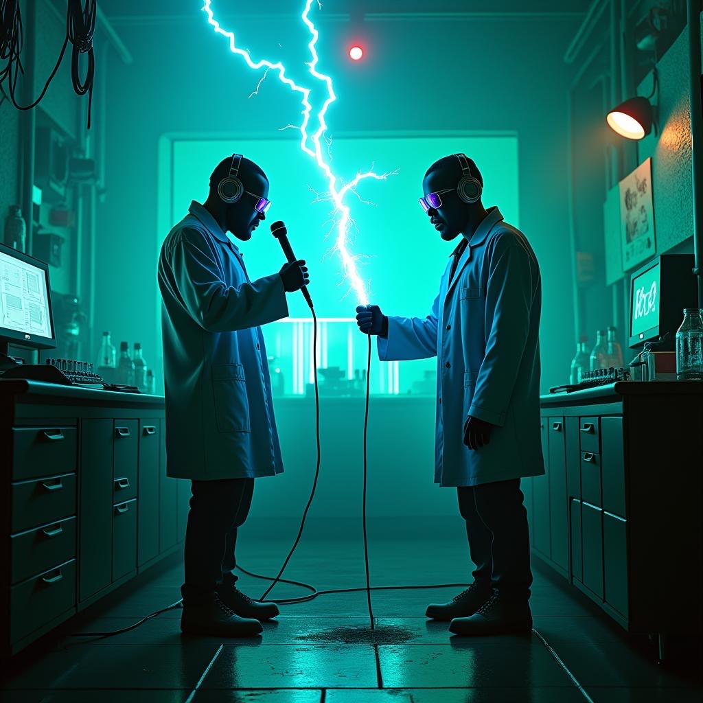BPM ≈ 90, 808-heavy swing with syncopated snare and electric pulse, Analog-tape crackle textures, Two voices (“Doc” & “Creation”) alternate like mad-scientist duet meets battle-rap, Vocals: Doc = raspy narrator in mono; Creation = bright stereo presence with metallic glitch FX, Mix rides energy waves through experimentation, overload, and resolution, Mood = Dark comedy meets Funk Frankenstein
