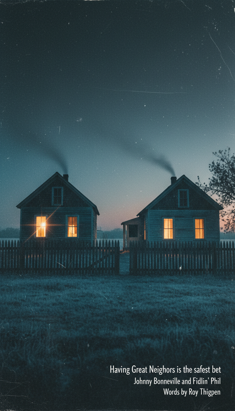 Simple Americana Folk Ballad, A tender, introspective duet with a classic, straightforward feel, The primary instrument is a resonant Acoustic Yamaha Steel-String Guitar (simple fingerpicking and light strumming), Percussion is a minimal, soft Brush Kit Drum (simple 4/4 rhythm), The mood is warm, honest, and contemplative, Vocal Duet: Primary singer Johnny Bonneville (thin, pure tenor) and Fiddling Phil Swaby (SC drawl tenor), Secondary voice is the zeta 5 string violin with zeta effects panel going through a 10 inch Zeta cabinet, Phil's strings play a major role in voicing the lyrics