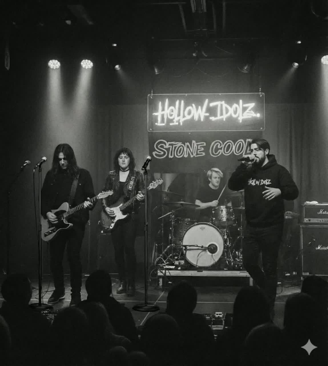 Raw garage-punk band performance with heavy fuzzed electric guitars, loose but driving live drums, and a gritty, human vocal delivery, Mid-fast tempo with push-and-pull timing, imperfect but intentional, Bass sits thick and dirty, slightly overdriven, locking tightly with the kick, Verses feel tense and restrained, guitars palm-muted or lightly choked, Choruses open up with wider fuzz, louder gang-style energy, and shouted backing vocals, Breakdown drops instrumentation to drums and bass or drums only, spoken or half-sung vocals close to the mic, then slams back in hard, Minimal polish, no synths, no glossy production, Roomy, live-take feel like a small club or basement show, Influenced by garage rock, modern punk, and fuzz-heavy alt bands, Emotional but tough — frustration and urgency without melodrama
