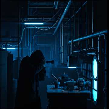 Industrial rock with espionage soundtrack elements, mechanical percussion, distorted bass synth, cold analog synth pulses, tremolo electric guitar, muted spy-jazz brass accents, tense cinematic atmosphere, dark minor key, gritty male vocal with gravelly tone, dramatic storytelling delivery, dynamic build from quiet covert tension to explosive industrial chorus, metallic textures, echoing factory ambience, suspenseful spy-film undertones, Arrangement prompt (optional but helps)