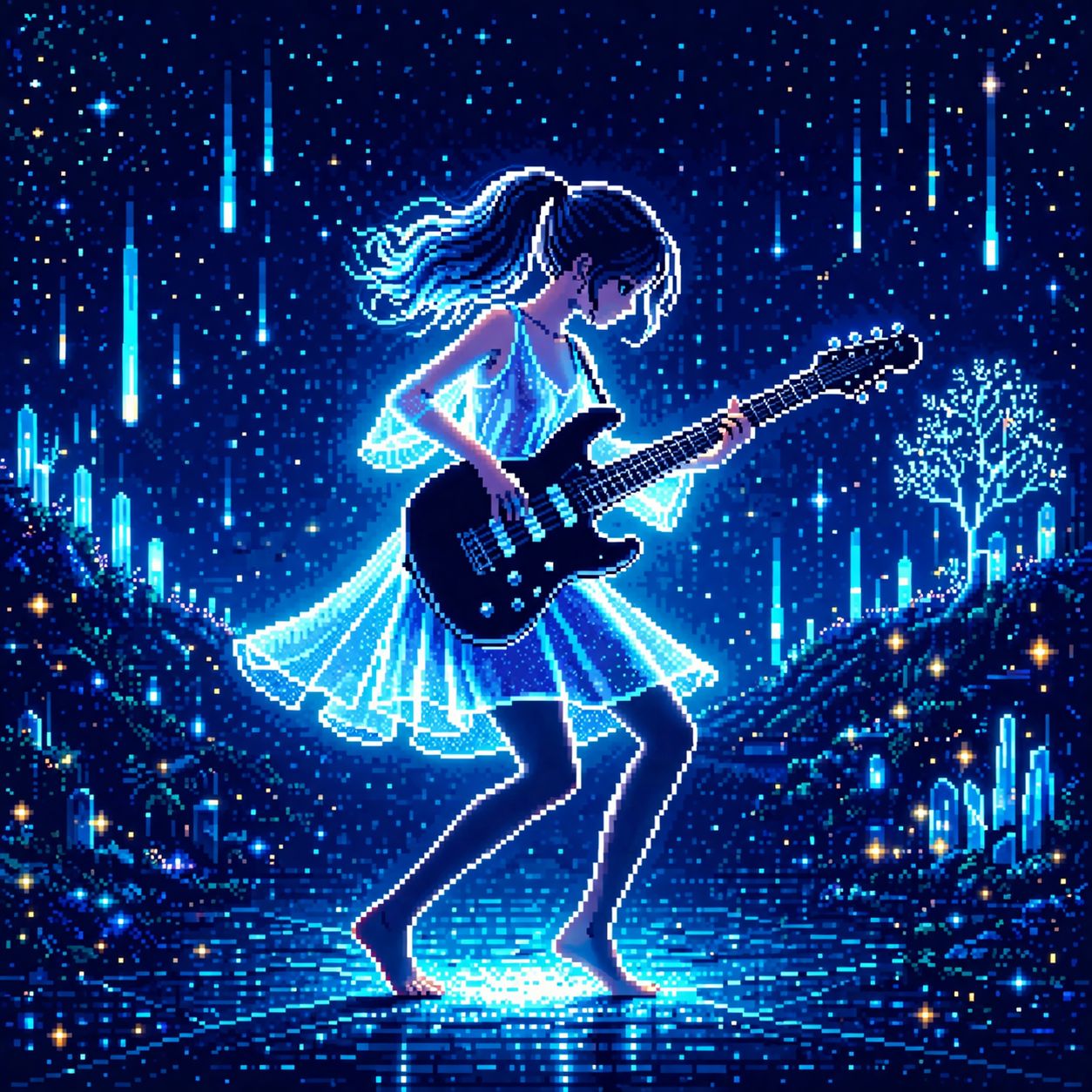 8-bit chiptune inspired game music with subtle polyrhythmic elements, tempo around 120 BPM, bright and slightly nostalgic mood, catchy and memorable main melody carried by square wave lead, fast 8-bit arpeggios supporting harmony, steady 4/4 kick and snare providing a stable groove, hi-hats and percussion introducing 3:4 polyrhythmic feel, clean to lightly overdriven electric guitar playing tight single-note riffs and octave lines with repeating 5-beat phrasing that shifts against the 4/4 rhythm, guitar adds groove and complexity without overpowering the chiptune melody, playful yet slightly mysterious atmosphere, dynamic loop-based structure suitable for retro action stage BGM, clean and punchy mix