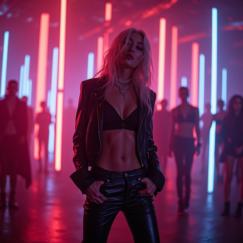 Madonna dance-pop style with a futuristic cyberpunk and high-energy EDM vibe