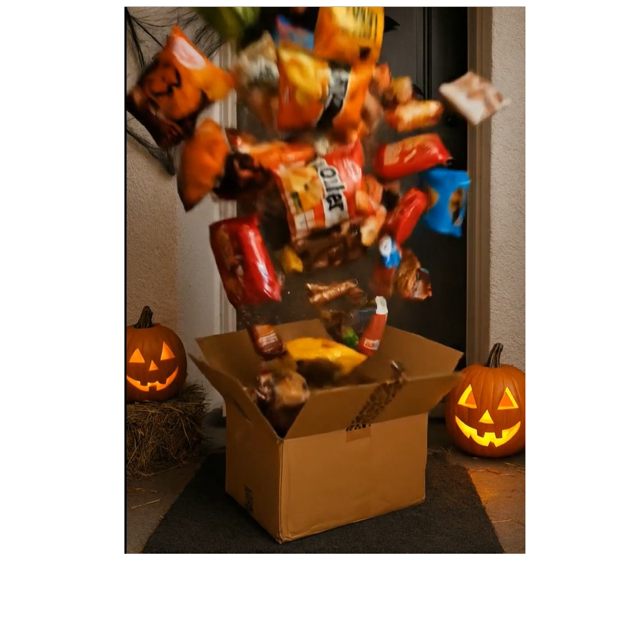 Mood: smug, teasing, Halloween trick-or-treat atmosphere, mild spookiness