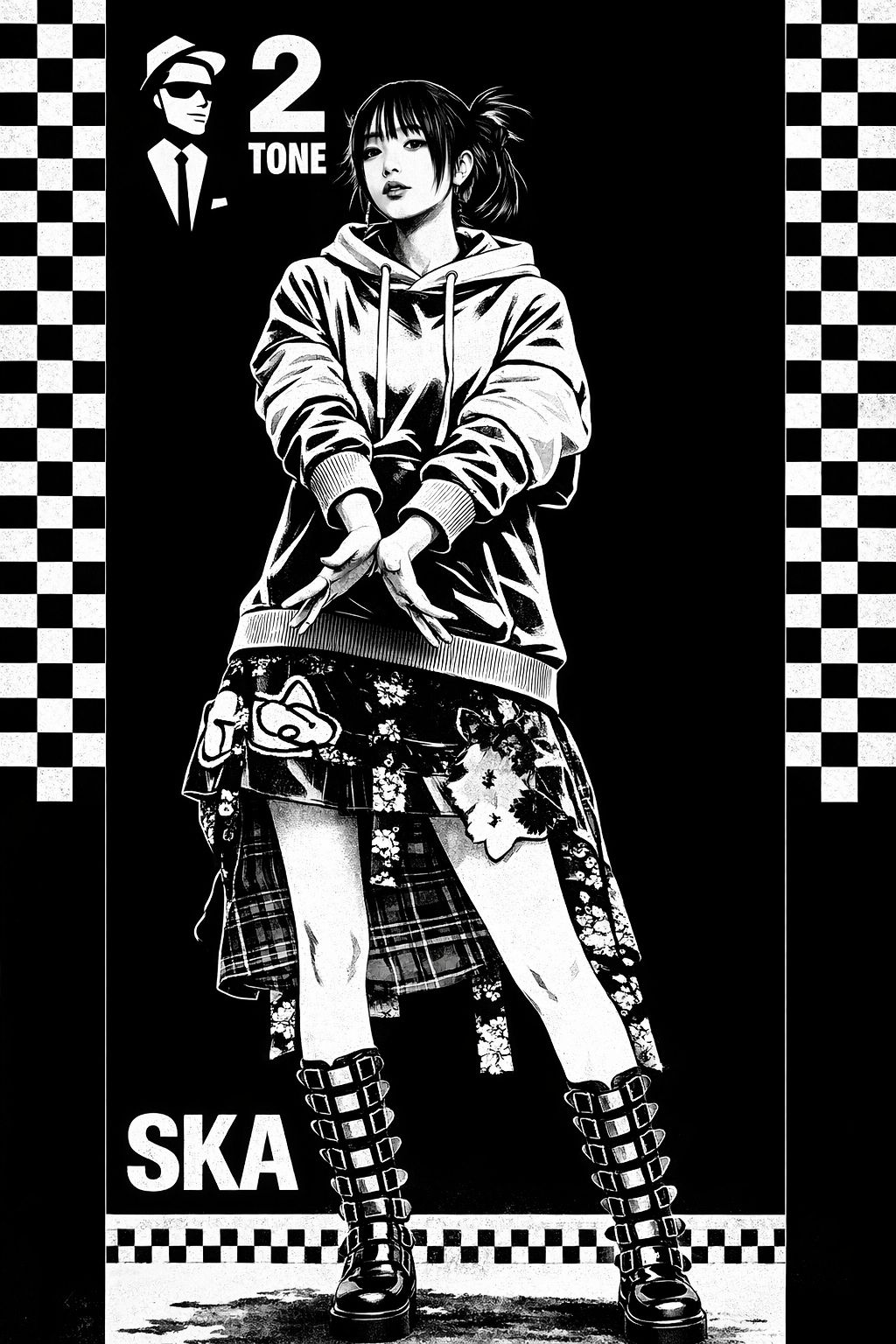Electro Ska + Electro Reggae, Breakbeat, 2-Tone homage, No guitar, No bass, Percussion only ensemble, TR-808 and Tabla beats, Xylophone and Marimba, Glockenspiel, Synthesizer stabs, Energetic, Fast tempo, Satirical, a *Kawaii* Female vocals *ano's style*, Shouting chorus, loud sound, minimalist structure and 3:2 polyrhythm, Three tablas and three TR-808, Tabla 1 + 808 #1: main breakbeat groove, Tabla 2: offbeat chord-cutting midrange rhythm, Tabla 3: floating polyrhythmic counter layer, 808 #2: rim and mid percussion support, 808 #3: glitch fills and rapid hi-hat rolls, 3:2 wooden mallet loop (xylophone, marimba, metal bars), Minimalist repetition with subtle evolution, Organic tabla vs machine rhythm contrast, Deep D sub bass tuned to tonic, The synthesizer plays strings pad during Chorus, its tone reminiscent of the Prophet-5 style, [Mastering: Ultimate Donshari V-EQ, psychoacoustic sub, crystalline highs, loud, aggressive dynamics (LUFS -8), immersive 3D]
