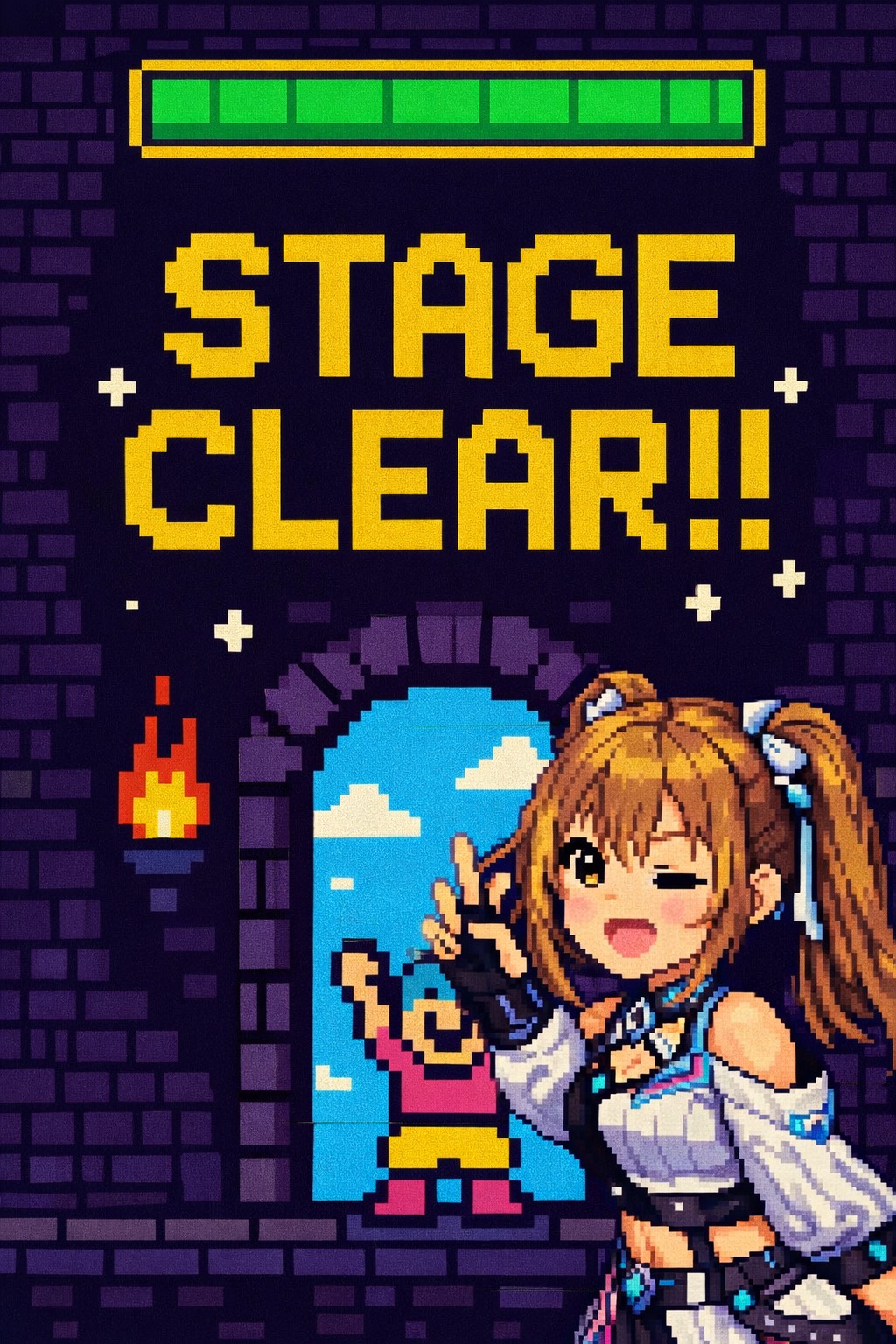 Minimal 8-Bit Chiptune Pop With Retro Game Energy, built around square wave lead melodies, triangle bass, tiny arpeggios, and punchy simple drum loops, Human vocal performance mixing Japanese and English phrases in a cute, emotional, slightly hyper style, Repeated hooks such as “えーあいに たすけてもらったったー, ” “LIFE one lost, ” “LIFE one up, ” “だれでも きょくが つくれるぞー, ” “へたでも なにか つくれるぞー, ” and “いそがしくても つくれるぞー” should feel catchy, chant-like, and easy to remember, “ごめんなさい” and “かなしい” sections should sound soft, fragile, and slightly downcast, while “ありがとう, ” “うれしい, ” and “えーあい さいこう” sections should sound bright, relieved, playful, and victorious, Add classic retro game sound effects: small damage hit for “lost, ” healing or item-get chime for “one up, ” buzzer and robotic voice for “game over, ” silence break and robotic “continue?, ” then energetic human response “okay! ready?” and “restart!”, Arrange the song like a game run: sad opening, restart bridge, emotional recovery, brainrot chanting, and a cheerful stag