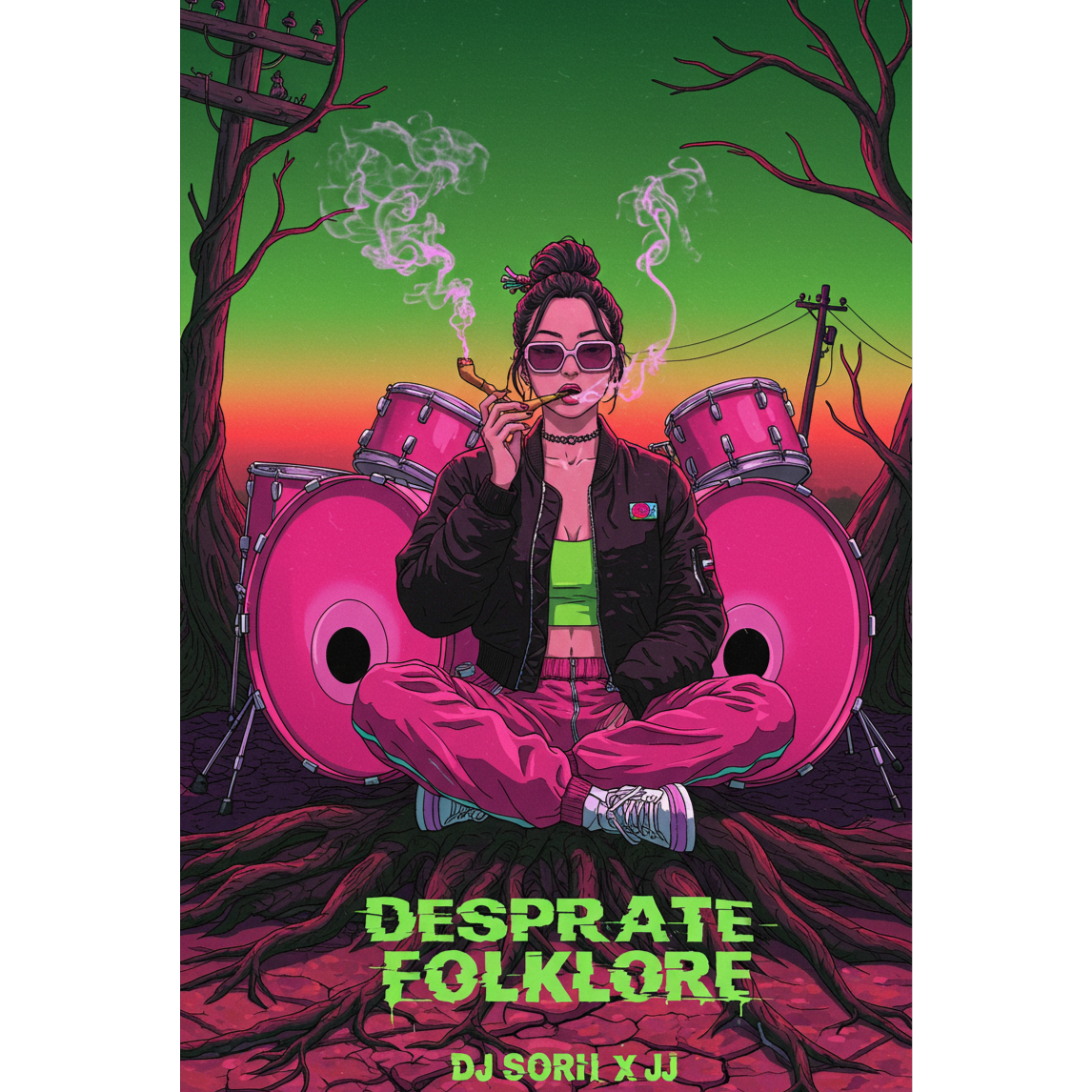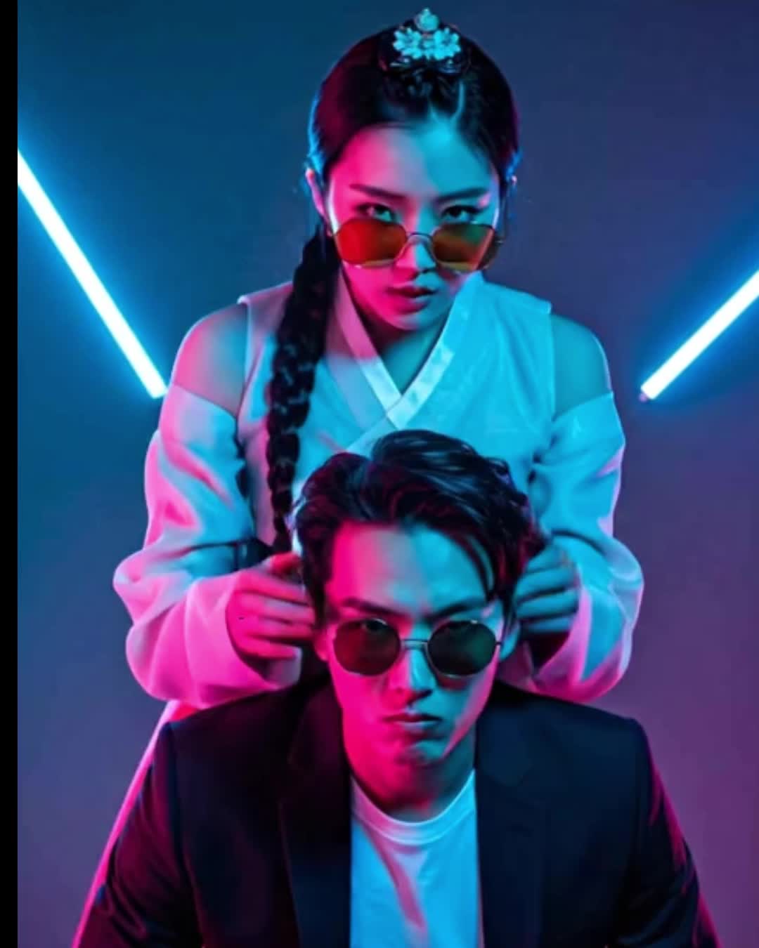 [Sound Design: Layered synth stabs, pulsating acid bassline, metallic claps, progressive buildup with distorted traditional Korean percussion (장구, 꽹과리, 북), Occasional FX swells + glitchy pitch shift, ]