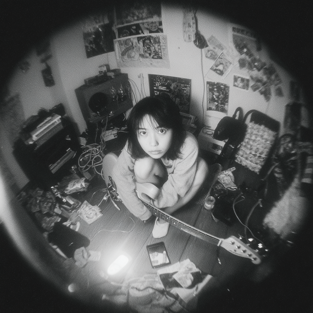 Dark ska-punk, A raw, emotional performance with a husky, fragile voice that is slightly off-key and full of voice cracks, clipped phrasing, no vibrato, Japanese