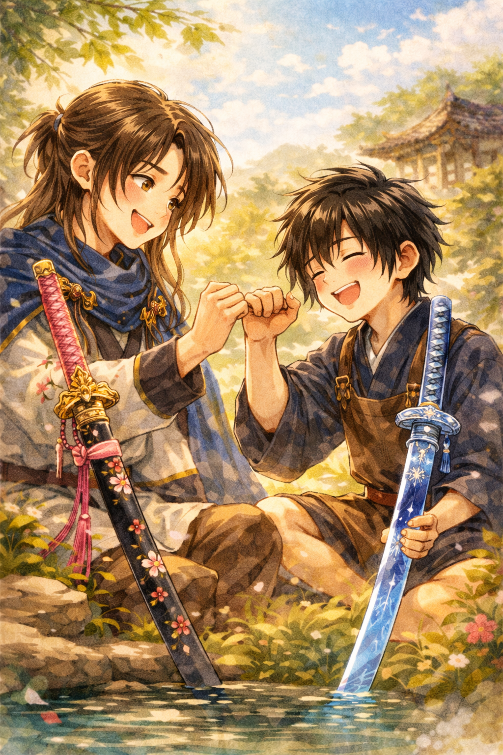 Sad Japanese rock ballad, emotional and dramatic, traditional Japanese instruments like koto, shakuhachi, and soft taiko prominently featured, soft piano and acoustic guitar intro, swelling electric guitars and strings, slow-tempo yet dynamic, two distinct vocal characters: one deep and resolute (protagonist), one gentle and trembling (friend), alternating verses and overlapping harmonies in chorus, conveying heartbreak, betrayal, and bittersweet farewell, occasional reverb and delay on vocals, cinematic tension, expressive guitar solos, rich atmospheric pads, melancholic melodies, emphasis on emotional highs and quiet intimate moments, reflective and nostalgic mood, storytelling style, song length 3-5 minutes