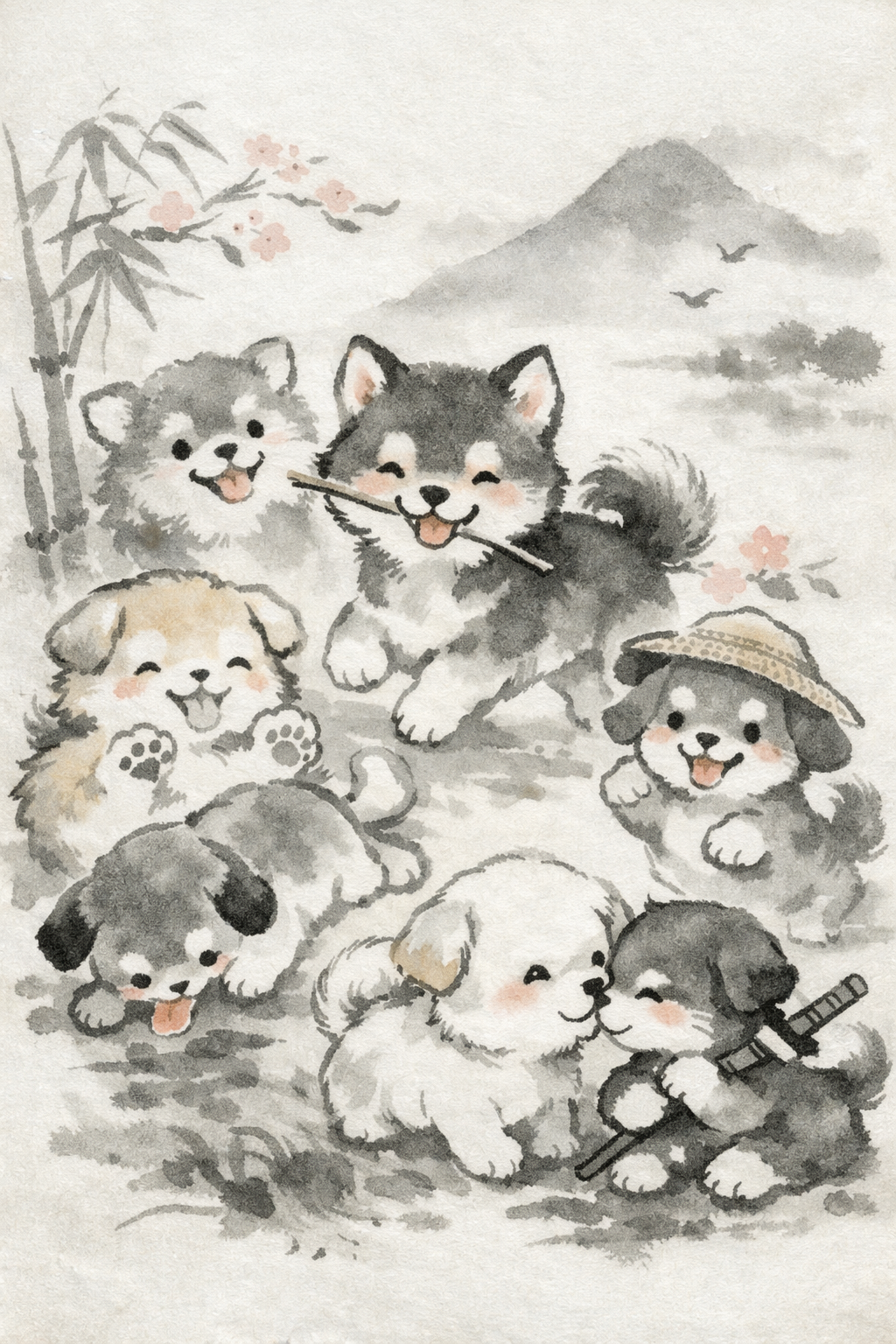 Cute and playful Japanese-inspired song with a strong traditional feeling, Light and bouncy tempo like small footsteps on a wooden engawa, Clearly Japanese pentatonic melodies, Soft koto and shamisen lead, with gentle shakuhachi phrases played playfully, not solemn, Light taiko, tsuzumi, wooden clappers, hand bells, and simple festival-style percussion, Sound is round, warm, and fluffy, Vocal is very cute and friendly, like a children’s song storyteller, with small playful calls such as “wan!” or “yoisho!” used naturally, Atmosphere feels like puppies joyfully running around a small shrine courtyard, Wholesome, cozy, and heartwarming, No dark tones, no epic drama, no modern pop gloss