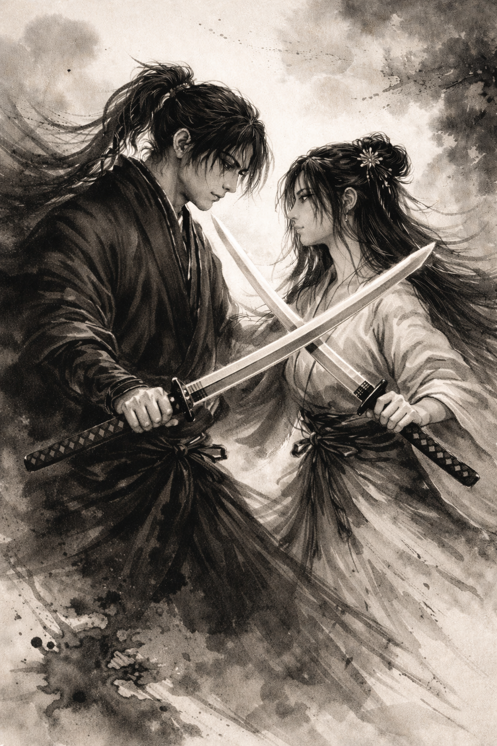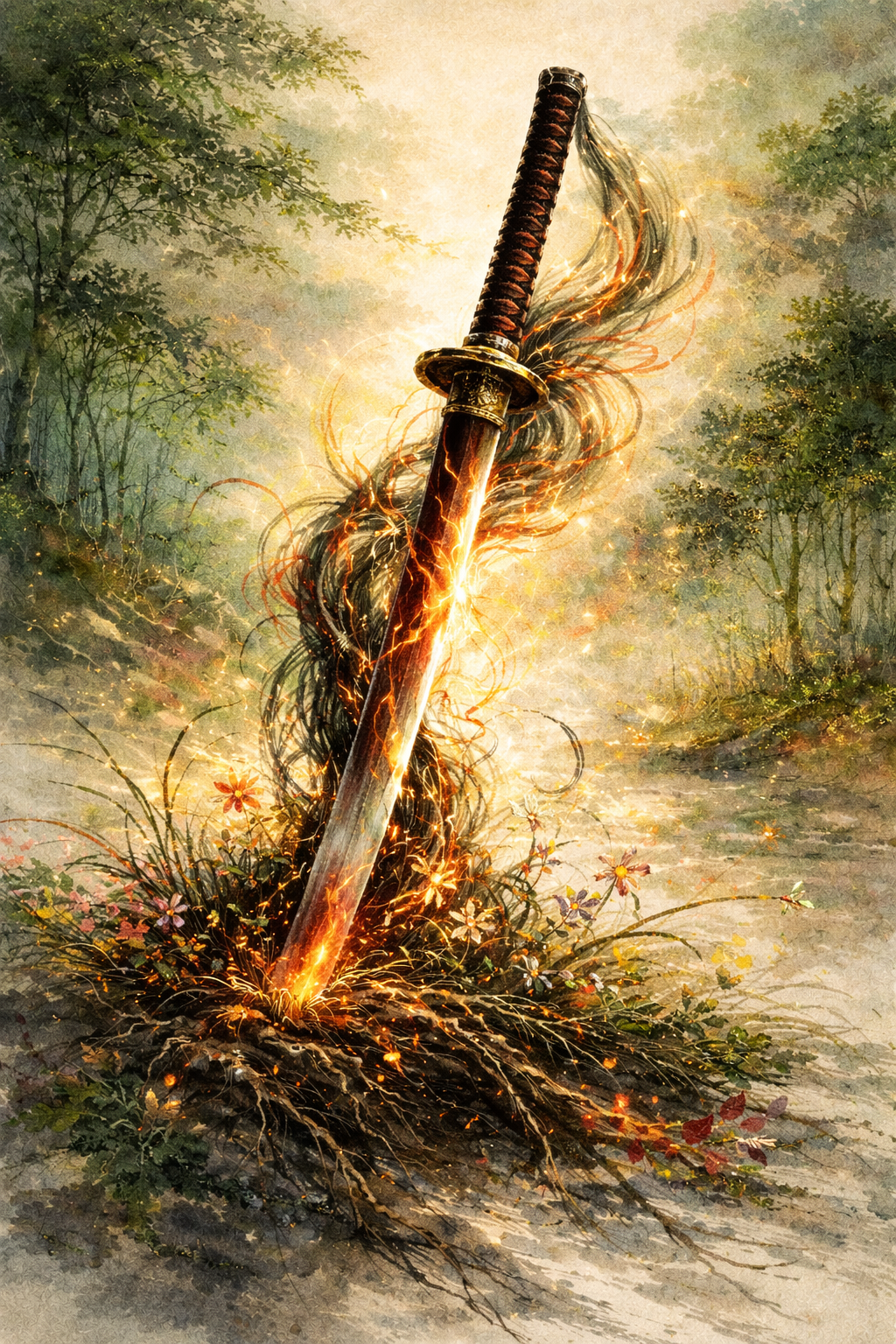 Japanese-style rock with emotional intensity and sharp contrast, clearly incorporating traditional Japanese instruments, Medium-fast tempo with strong forward momentum, not slow, Powerful rock band core featuring distorted electric guitars and driving bass, combined with taiko-style drums for weight and tension, shamisen or koto phrases woven into riffs and transitions, and subtle shakuhachi accents for atmosphere, Female vocal, clear and resolute, carrying both warmth and steel, Theme: mutual acceptance as a double-edged sword — protecting and challenging each other, cutting open new possibilities while risking pain, Lyrics feel poetic, restrained, and serious, with imagery of blades, resolve, and shared paths, Mood balances tenderness and danger, calm verses contrasted with explosive choruses, No pop sweetness, no metal excess — refined, dramatic wa-rock fusion with emotional weight, restraint, and determination