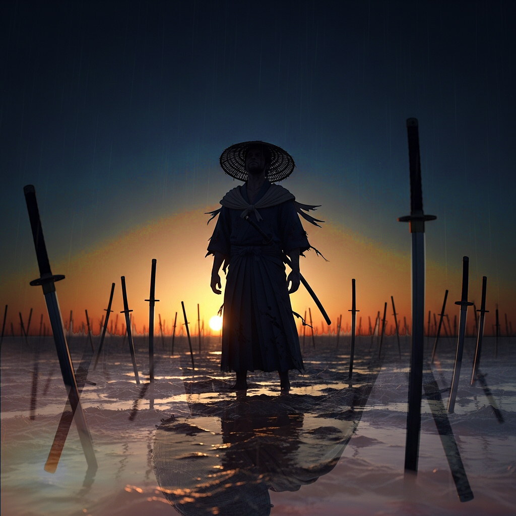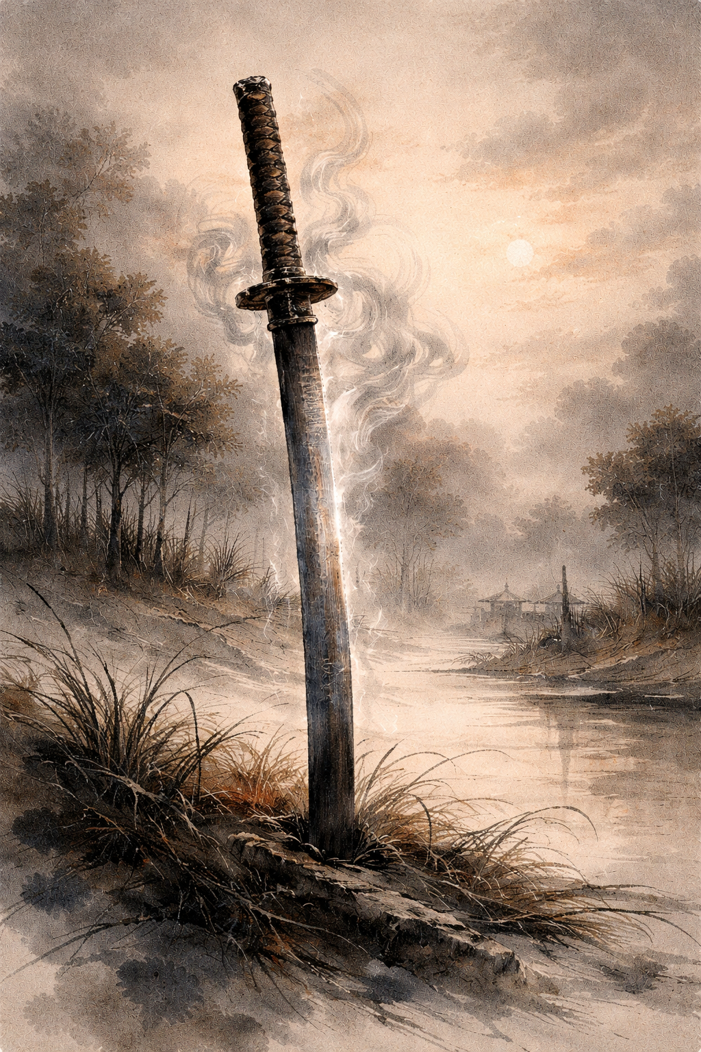 Japanese ambient music with a sacred and impartial atmosphere, Very slow tempo around 50–60 BPM, No clear rhythm, floating pulse only, Traditional Japanese instruments: sustained koto harmonics, low shamisen drones, distant shakuhachi breaths, and deep soft taiko resonance used sparingly like a heartbeat, Sound feels cold yet gently warm, emotionless but not cruel, No dramatic build-up, no climax, Everything is slowly shaved away equally, leaving only silence and balance, Minimal melody, long reverb, wide space, Feeling of a cursed sacred blade spreading its influence quietly over land, Neutral, calm, inevitable, No hope, no despair, only quiet continuation, Cinematic but restrained, meditative, austere, timeless