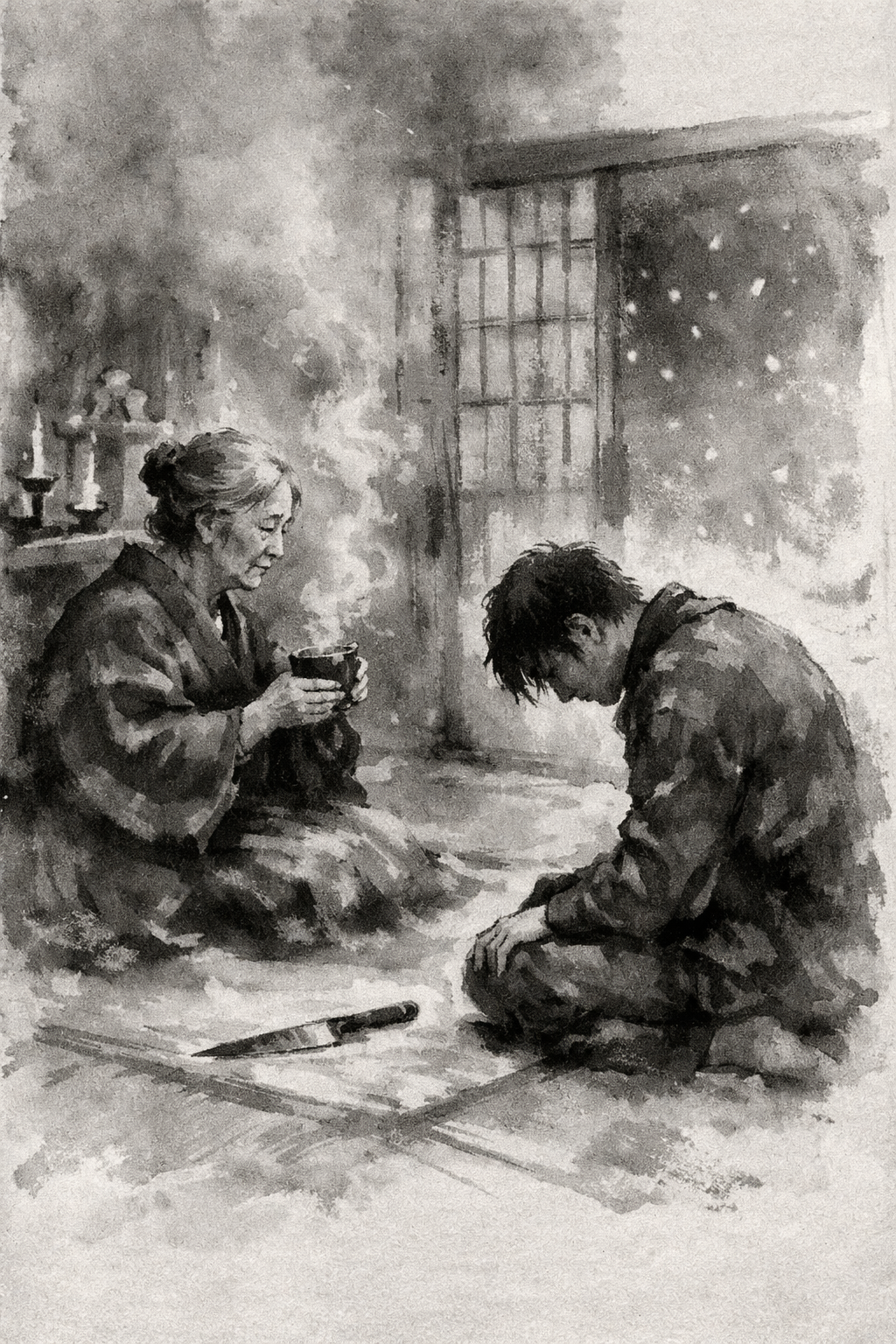 Traditional Japanese enka fused with shigin chanting, Female lead vocal enters immediately at the beginning of the track, slow to mid-slow tempo, deep and weathered tone, singing from the perspective of an elderly woman, Verses sung in restrained enka style with subtle vibrato and long breathy phrases, Chorus expands with sorrowful melodic lines, Shigin elements appear as rhythmic spoken-chant phrases, stern and dignified, echoing moral weight, Minimal instrumentation: shamisen, low koto, sparing taiko, deep bass underpinning, Minor key, dark snowy atmosphere, Theme of mercy, sin, redemption, quiet strength, No modern sounds, no pop feeling, Intimate, human, heavy silence between notes, vocals lead the musical narrative from the start