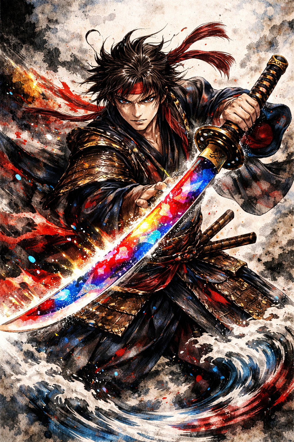 Powerful Japanese-style rock driven by traditional instruments, Fast to mid-fast tempo with strong forward momentum, Heavy Yamato-taiko drums as the core rhythm, deep odaiko pulses shaking the ground, sharp shime-daiko strikes cutting like blades, Shamisen and koto riffs replace guitars as main hooks, aggressive and percussive, supported by distorted electric guitar for weight, Bamboo flute accents add tension between phrases, Male vocal, raw and resolute, slightly husky, delivering lyrics with grit and determination, No softness, no pop tone, Theme of cutting through life’s confusion, sweet name with sharp edge, candy-like colors forged by hardship, Dramatic dynamic shifts between verses and explosive choruses, Epic, fierce, ritualistic energy, modern Japanese rock fused with ancient spiri