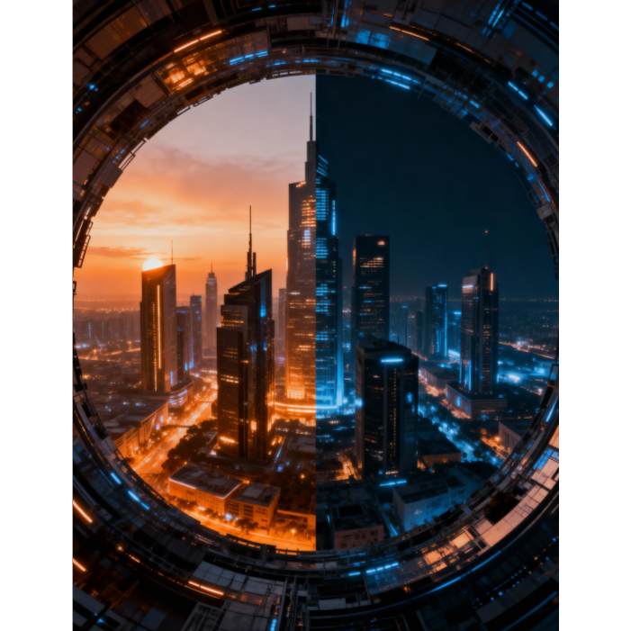 progressive trance, ambient techno elements, 126BPM, evolving pads, cyclic arpeggios, shifting textures from bright morning to dark night, field recordings (birds, traffic, nightlife), emotional layering, seamless transitions