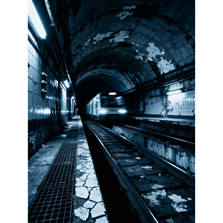 industrial techno, dark ambient influence, 128BPM, metallic resonance, distorted low-end, subway ambience (rails, brakes, intercom noise), glitch textures, hypnotic repetition, underground atmosphere