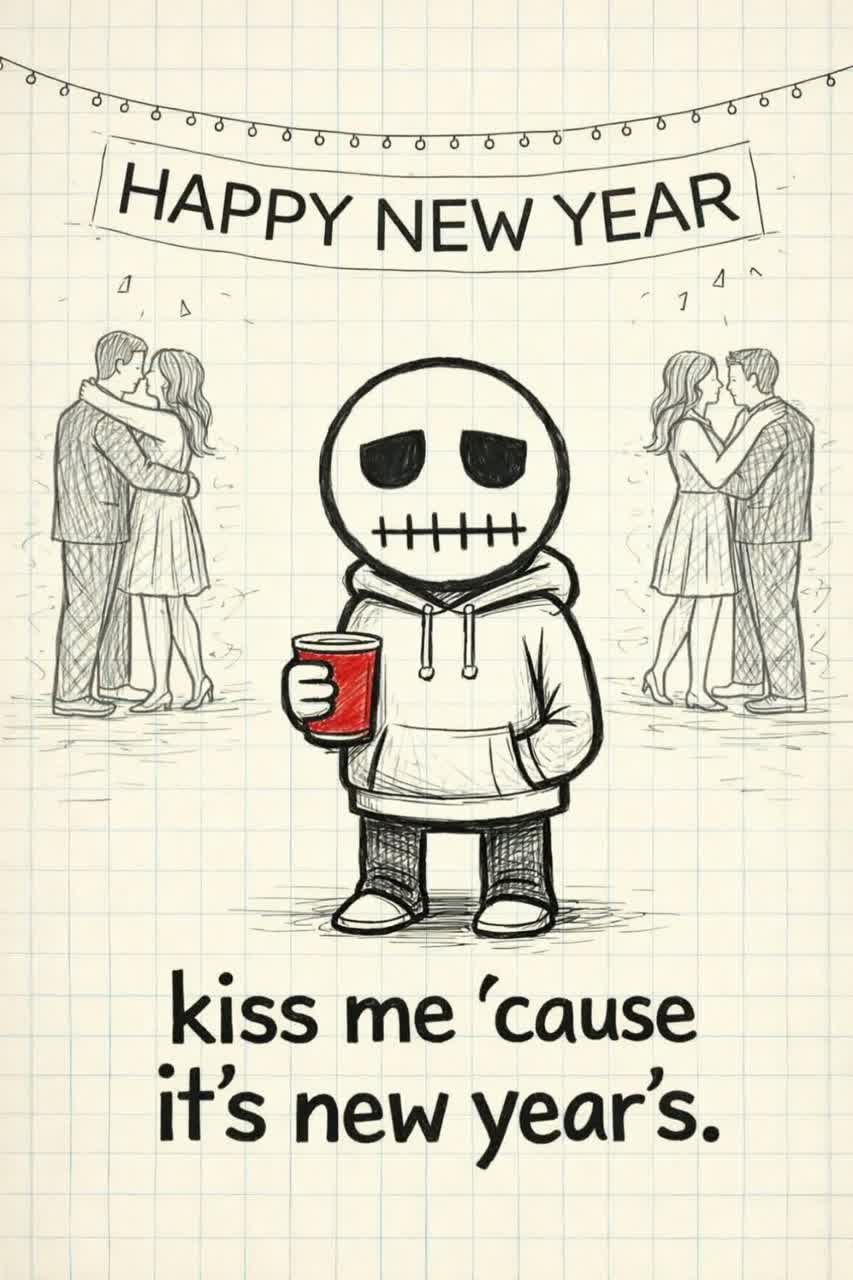 Lo-fi emo rap with pop-punk edges, raw and simple, Minimal 808 beat with a crunchy hi-hat loop, layered over a two-chord clean electric guitar riff, Vocals are monotone, sing-spoken, slightly off-key in a charming way, with light autotune and doubling on a few words, Delivery feels like a messy diary entry — lowercase, blunt, and self-deprecating, Keep the mix thin and DIY, like it was recorded at 3 a, m, in a bedroom on cracked software, spilling out cafeteria angst and outsider vibes, ending with a shrug instead of resolution