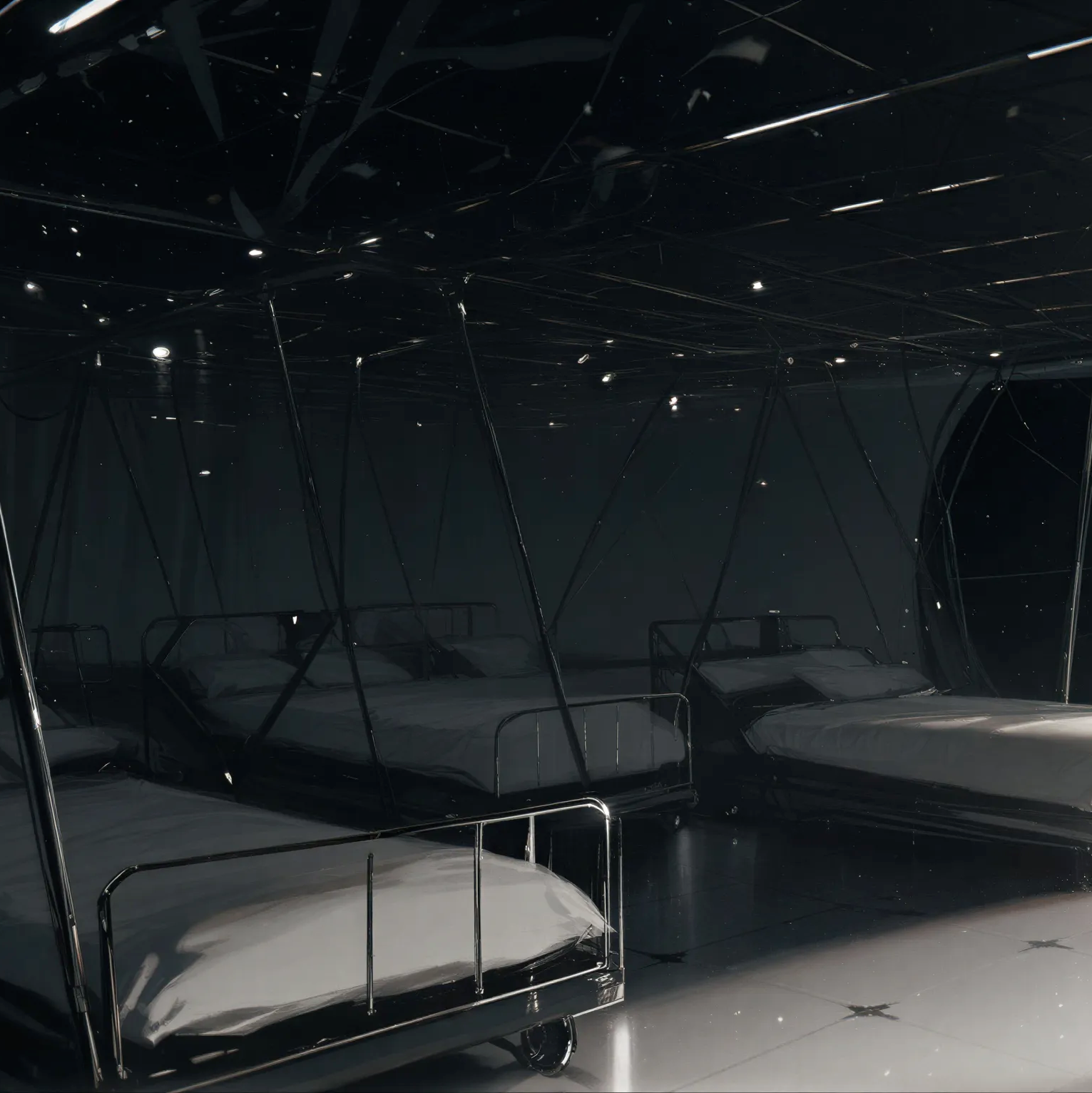 Atmosphere: Silent medical bay inside ARK EIDOLON, rows of sleeping bodies, sterile white lights, aftermath of transfer