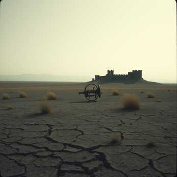 Stark cinematic orchestral piece, desolate and imposing, 100 BPM, G minor, Opens with deep timpani rumble like distant hooves on hard earth and a low bleak brass drone — a fortress on an empty plain, no softness anywhere, Wide hollow string pads create a sense of vast barren grasslands stretching to a merciless horizon — dry, windswept, stripped of grace, Solo French horn carries a lonely austere theme, endurance without beauty, survival without comfort, Low male choir hum enters like stone grinding, geological and cold, Sparse dry percussion suggests cracked earth and dust, The atmosphere is grand but bleak — this is a place built to withstand, not to welcome, Instruments thin to the French horn alone, exposed against silence, A single fragile flute enters underneath, tentative and lost, slightly dissonant, a sea creature arriving in a world with no water, The two find an uneasy unresolved harmony, Desolate, vast, powerful, Fantasy film score, Instrumental with low wordless male choir, ‑No electric guitar, ‑no electric keyboards, ‑no modern instruments