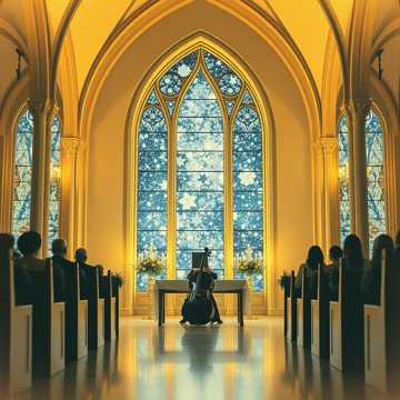 Sacred romantic orchestral piece, reverent and transcendent, 80 BPM, B-flat major, Hushed strings and ethereal wordless choir create an atmosphere of temple starlight, Celtic harp plays a processional melody, Solo cello enters with an emotional, singing melody representing wedding vows — intimate and exposed, Full choir and lush orchestra join for a transcendent climax — beauty, not bombast, Resolves gently to intimate strings and harp, Cathedral reverb throughout, Should feel like starlight and candlelight and the most important promise ever made, Fantasy film score, Instrumental with wordless choir, ‑no electric guitar, ‑no electronic keyboards